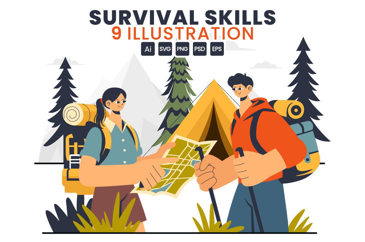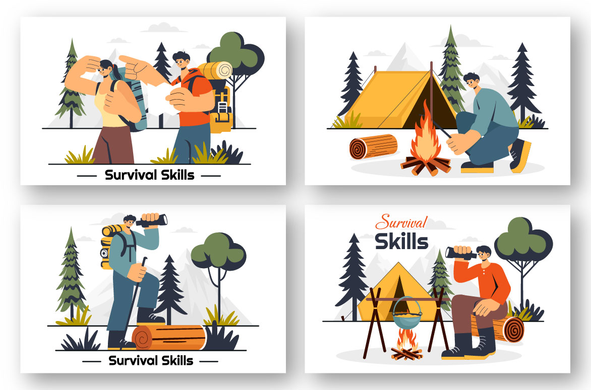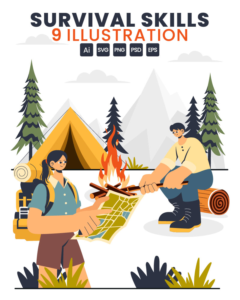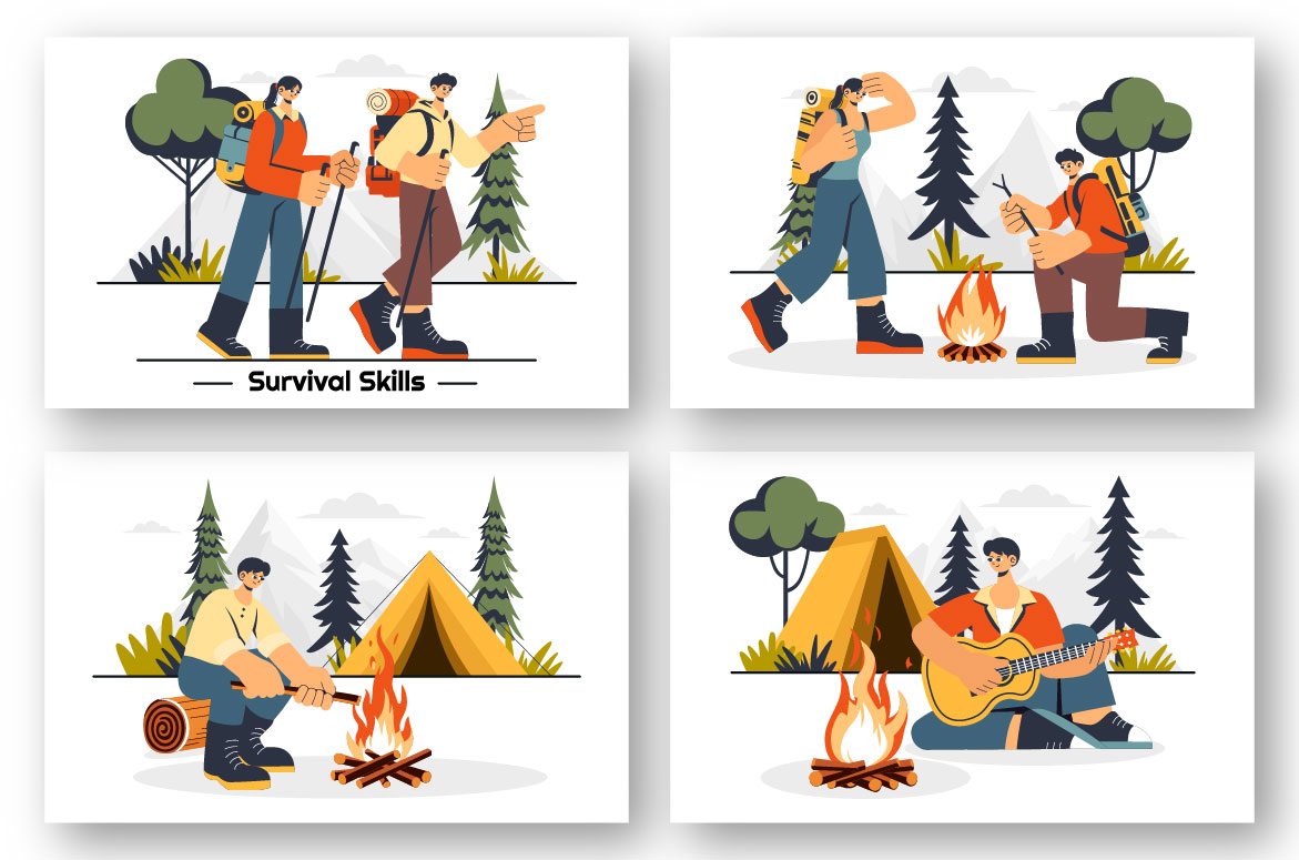 Survival Skills Summer Camping Vector Illustration featuring Tent Camping Services, Outdoor Accommodation, Jungle Exploration, and Relaxation Suitable for Poster, Web Banner, Brochure, Landing Page and Others Background Template Features: