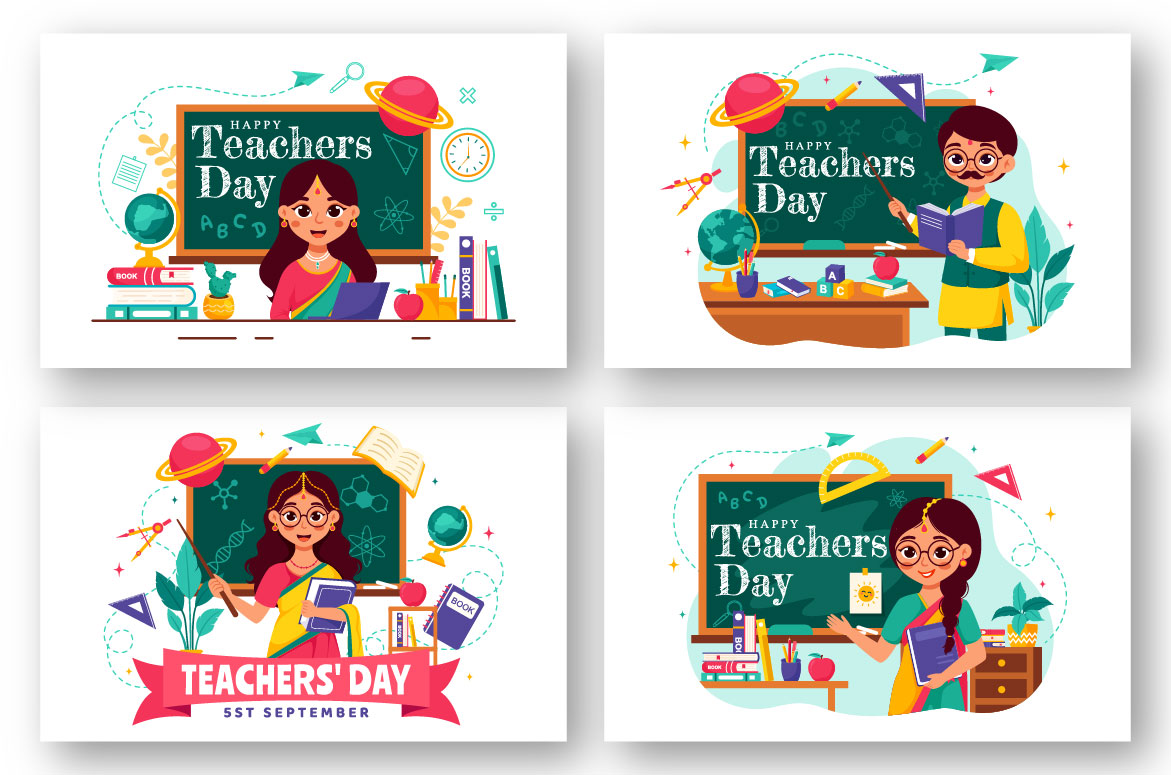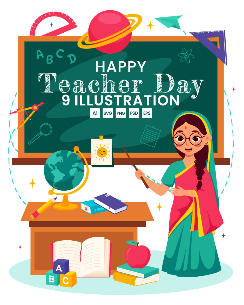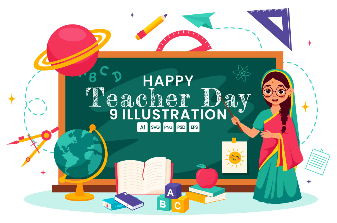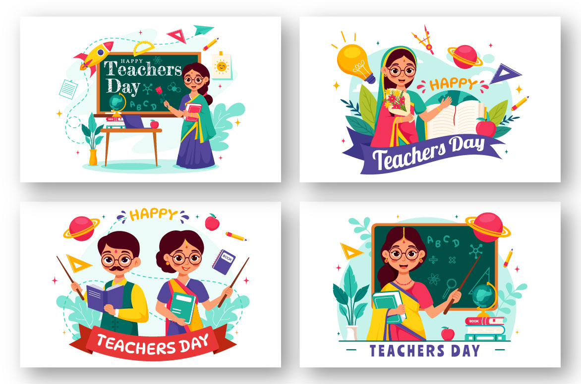 Happy Teachers Day in India Vector Illustration featuring Teacher Wearing Traditional Clothes and School Equipment in a Flat Cartoon Background Suitable for Poster, Web Banner, Brochure, Landing Page and Others Background Template Features: