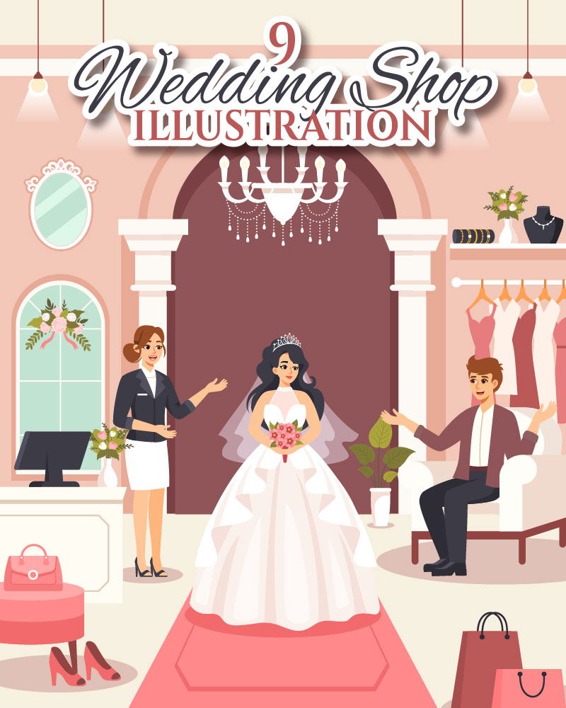 Wedding Shop Vector Illustration with Lover Looking for Jewellery, Beautiful Bride Gowns and Accessories to Get Married in Flat Cartoon Background Suitable for Poster, Web Banner, Brochure, Landing Page and Others Background Template Features: