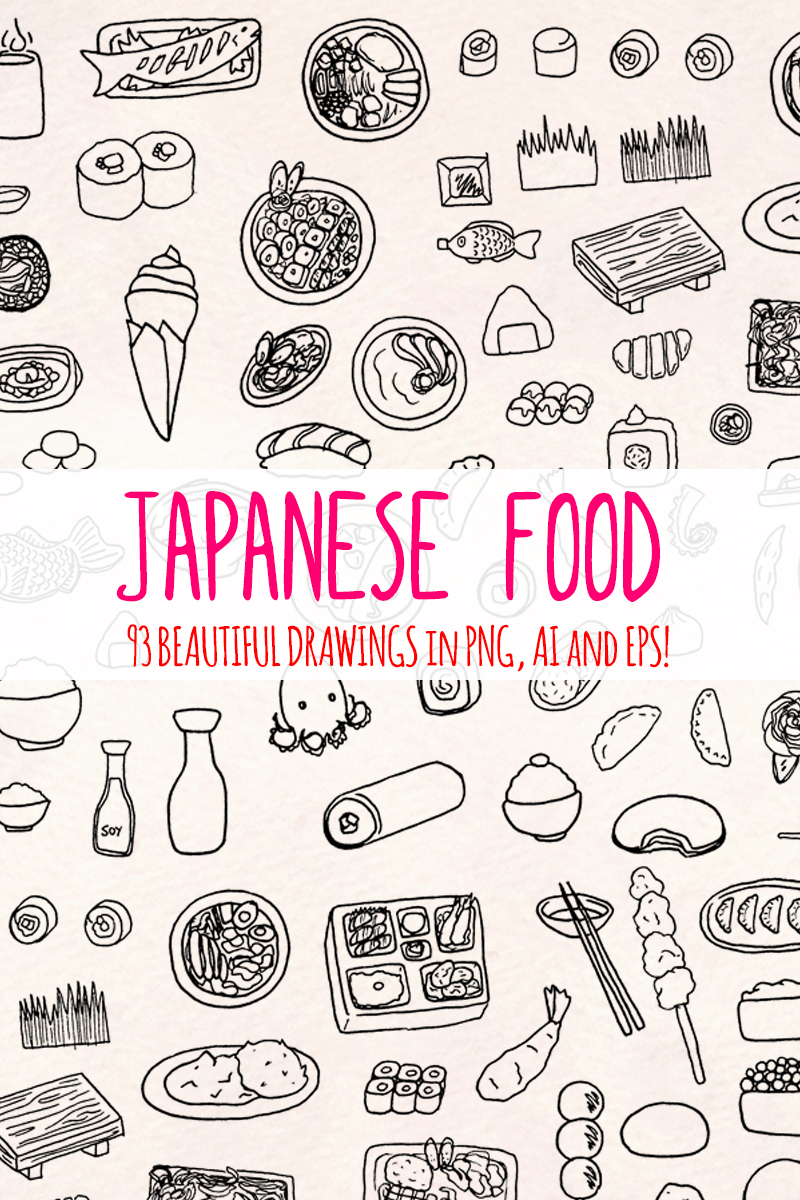 This pack contains 93 themed drawings/paintings including sushi, tempura, ramen and soba. The PNGs are the original hand drawn scans and the EPS and AI files are slightly smoothed versions for accurate scaling.