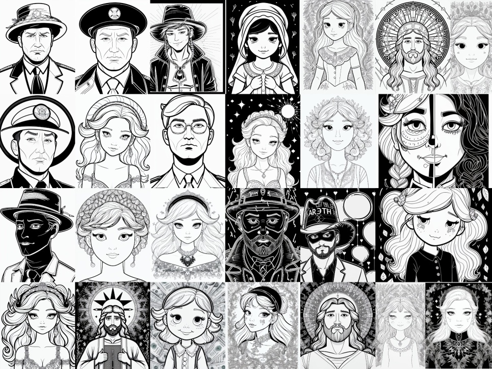 This extraordinary AI art collection brings together 26 uniquely designed characters in one stunning digital masterpiece! Each portrait has been carefully crafted by artificial intelligence to showcase incredible diversity - from mysterious figures in vintage hats to angelic faces, professional workers, and cultural icons. This black-and-white gallery celebrates the endless possibilities of AI creativity, where each of the 26 individual designs contributes to a harmonious tapestry of human expression and imagination.