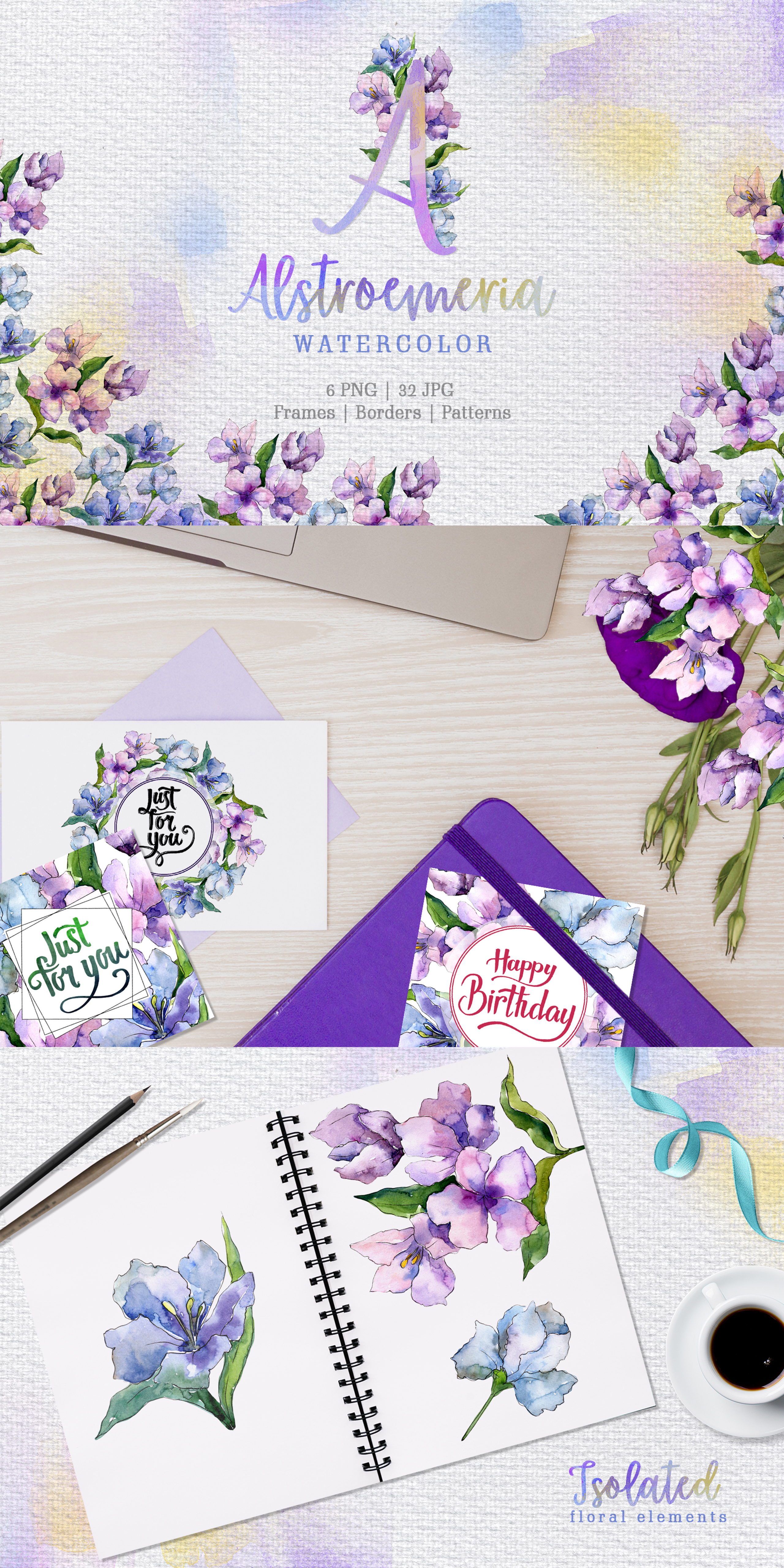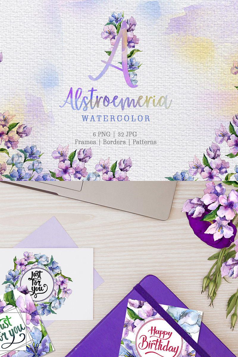 Alstroemeria Violet Watercolor png clipart of 38 files. Ideal material for DIY, wedding invitations, greeting cards, quotes, blogs, posters and more.