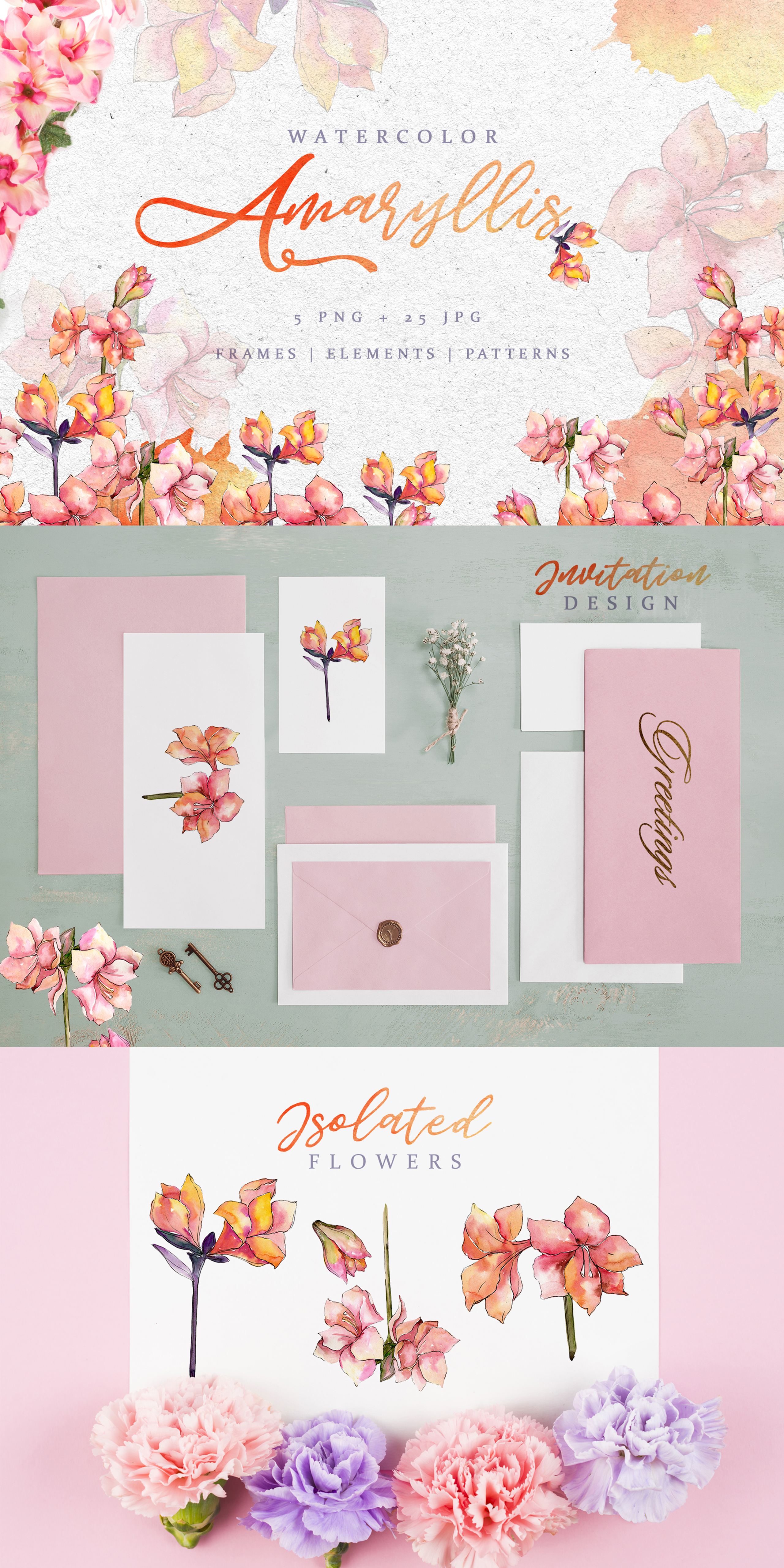 Amaryllis Watercolor Pink png clipart of 30 files. Ideal material for DIY, wedding invitations, greeting cards, quotes, blogs, posters and more.