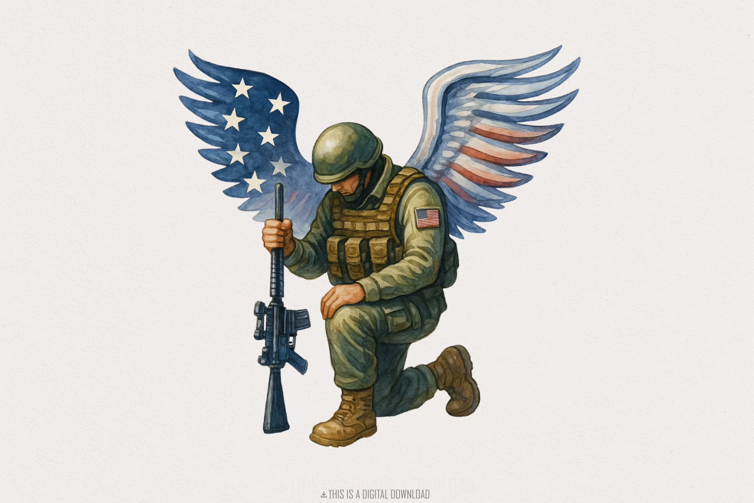 American Soldier Angel Man Praying PNG, USA Flag, Patriotic Art, Veteran Gift, America Proud, 4th Illustration