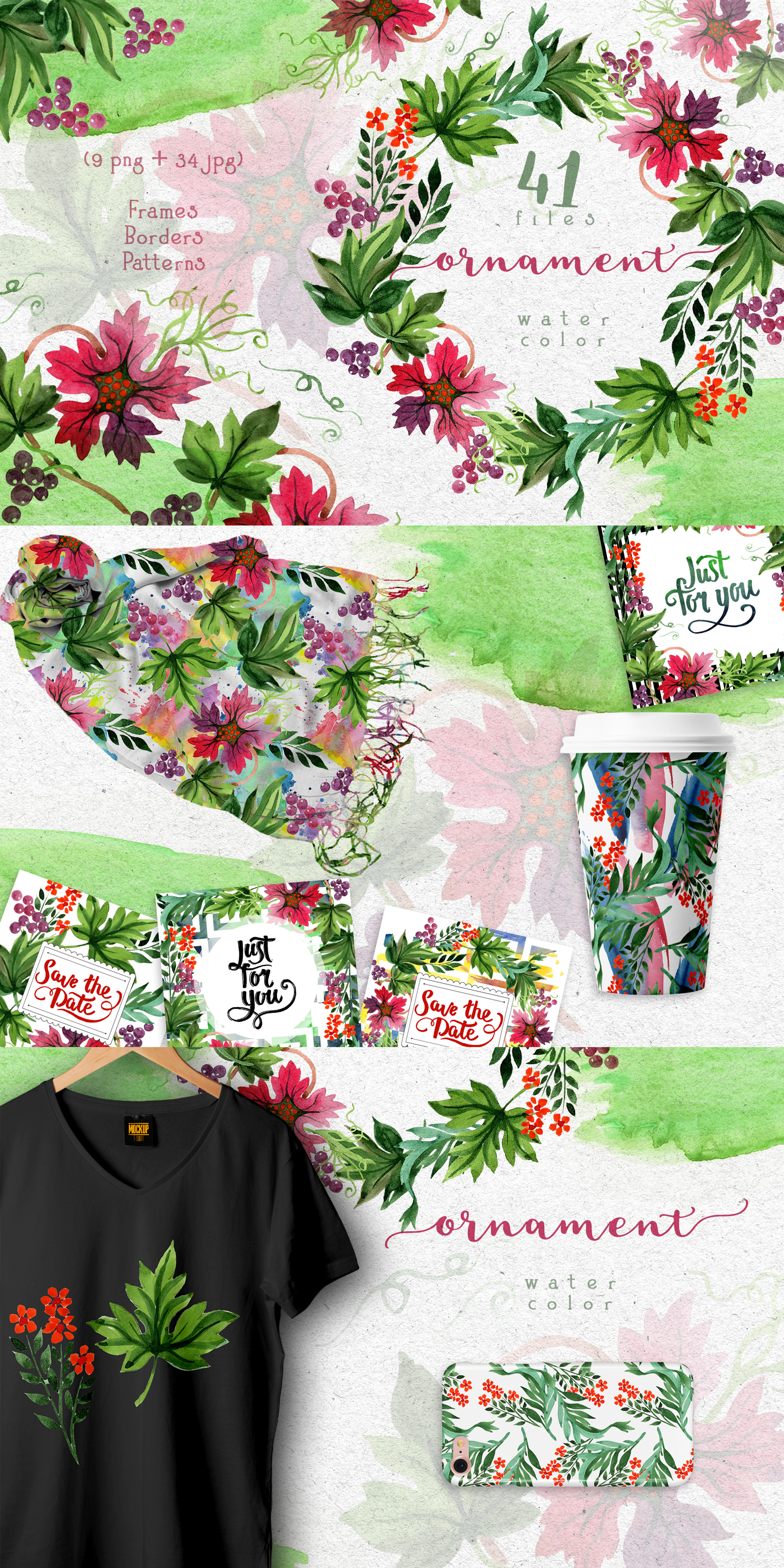 Elements are painted by hand and every image is a separate file. The graphics are a PNG file, 300 dpi, without background. Patterns and Frames are JPG size 3500x3500px.