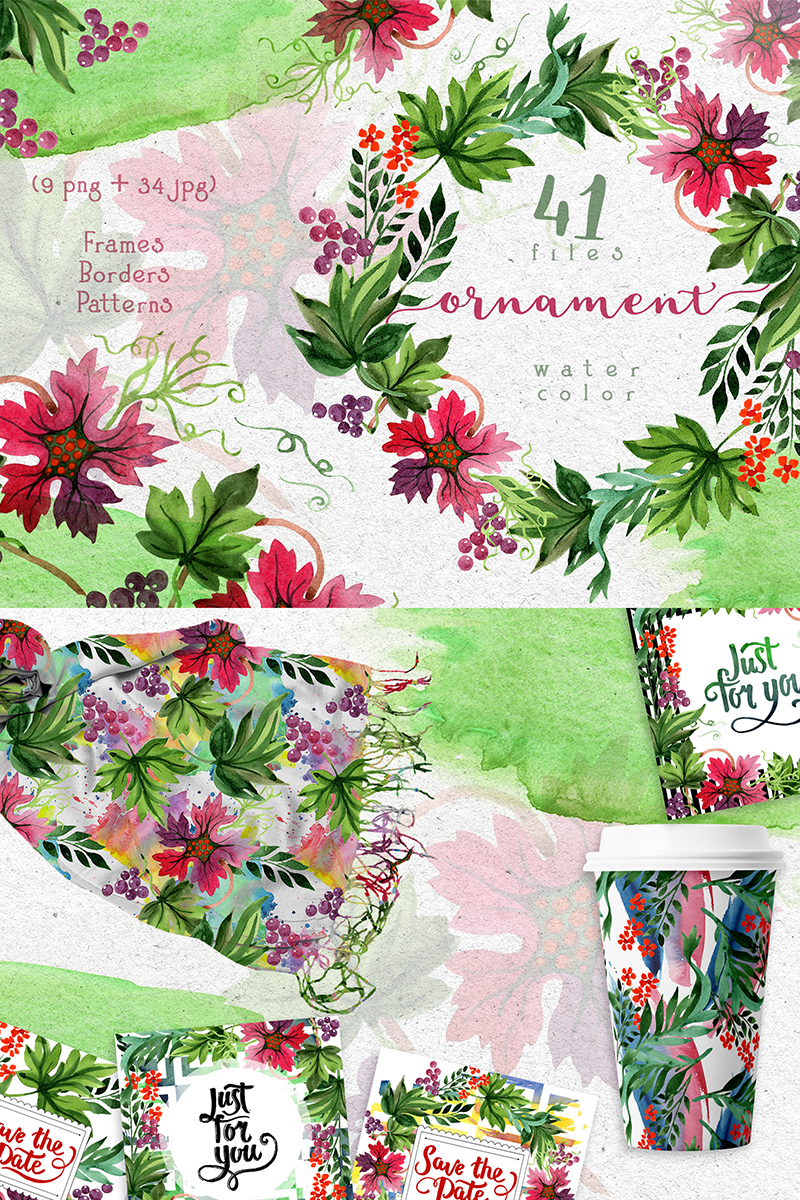 Elements are painted by hand and every image is a separate file. The graphics are a PNG file, 300 dpi, without background. Patterns and Frames are JPG size 3500x3500px.