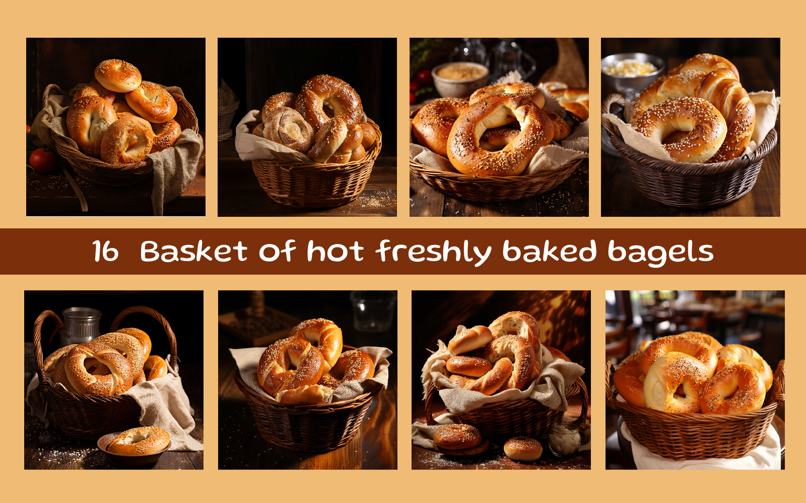 Basket of hot freshly baked bagels. Enjoy the art of baking with our pastry and bread AI images. This delightful artwork captures the essence of this classic pastry, showcasing its golden crust and soft, fluffy texture. Perfect for bakery menus, recipe books, or culinary-themed designs, social media post, banner and etc. it adds a touch of artisanal charm to your creative projects.