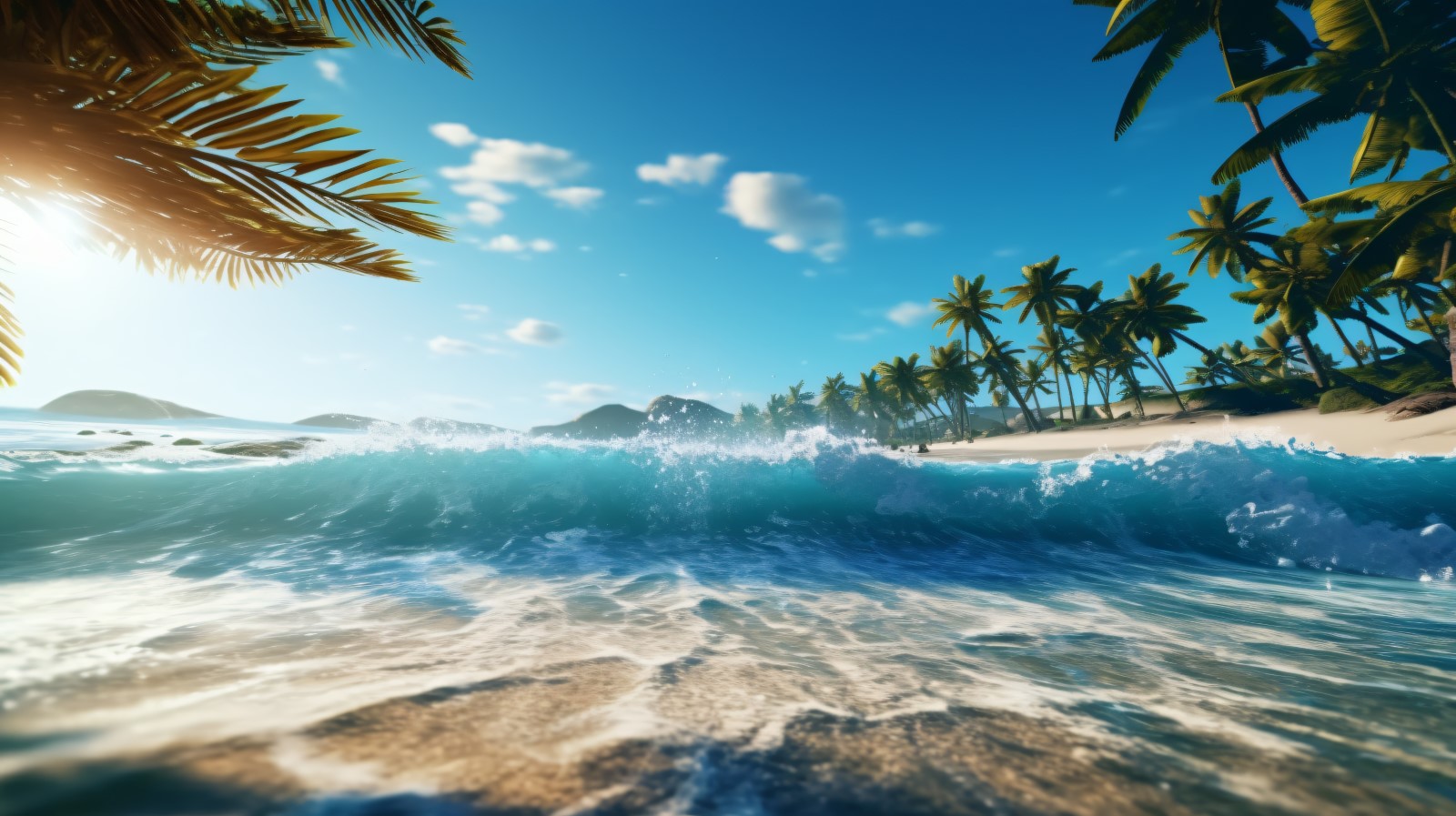 Amidst the warmth of summer, the desert landscape becomes a canvas for indulgence, portraying a delectable scoop of ice cream against a backdrop of endless dunes. An aerial beach scene captures the mesmerising waves surfing along the amazing blue ocean, with distant islands adding to the allure of the summer setting.