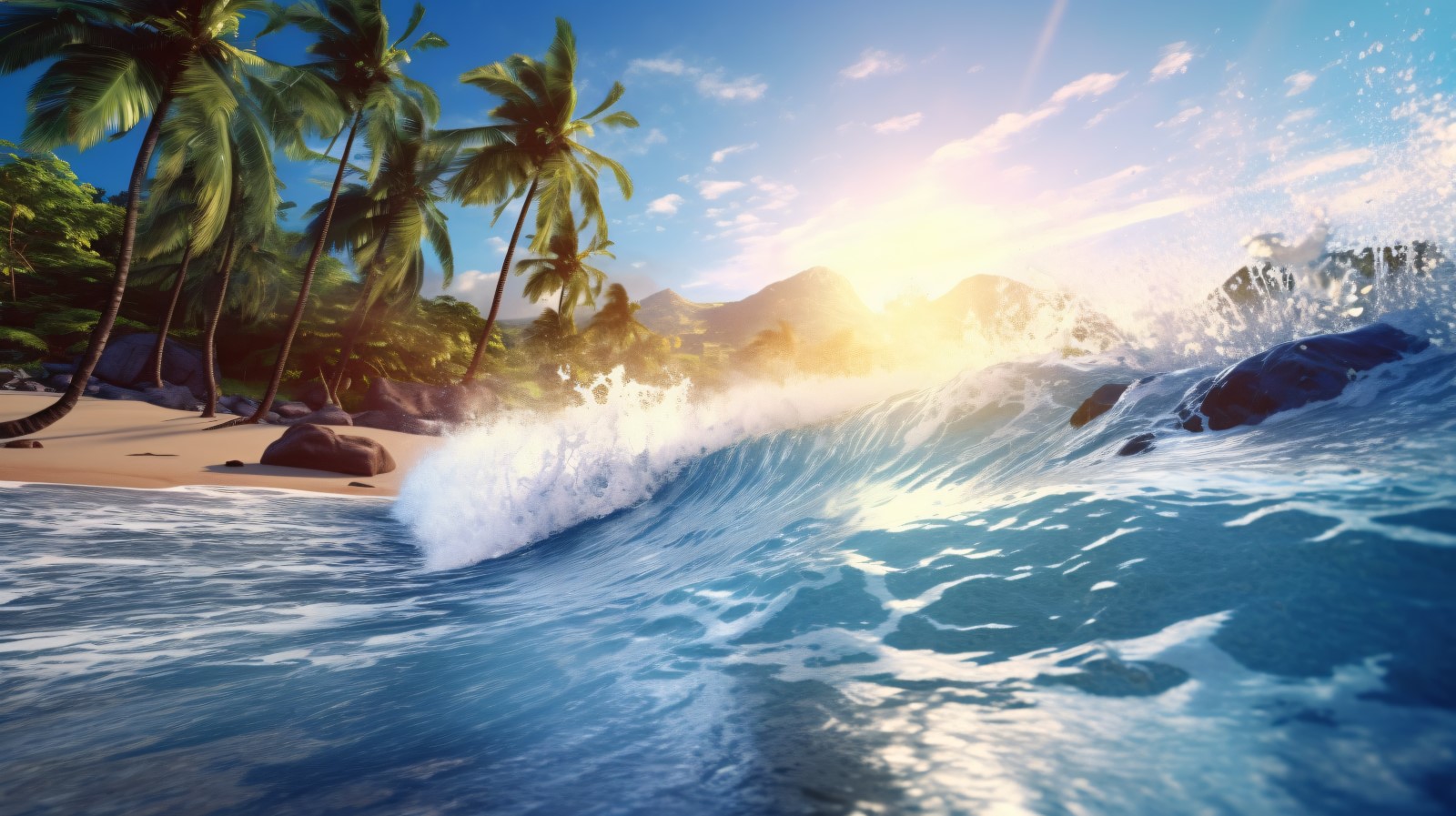Amidst the warmth of summer, the desert landscape becomes a canvas for indulgence, portraying a delectable scoop of ice cream against a backdrop of endless dunes. An aerial beach scene captures the mesmerising waves surfing along the amazing blue ocean, with distant islands adding to the allure of the summer setting.