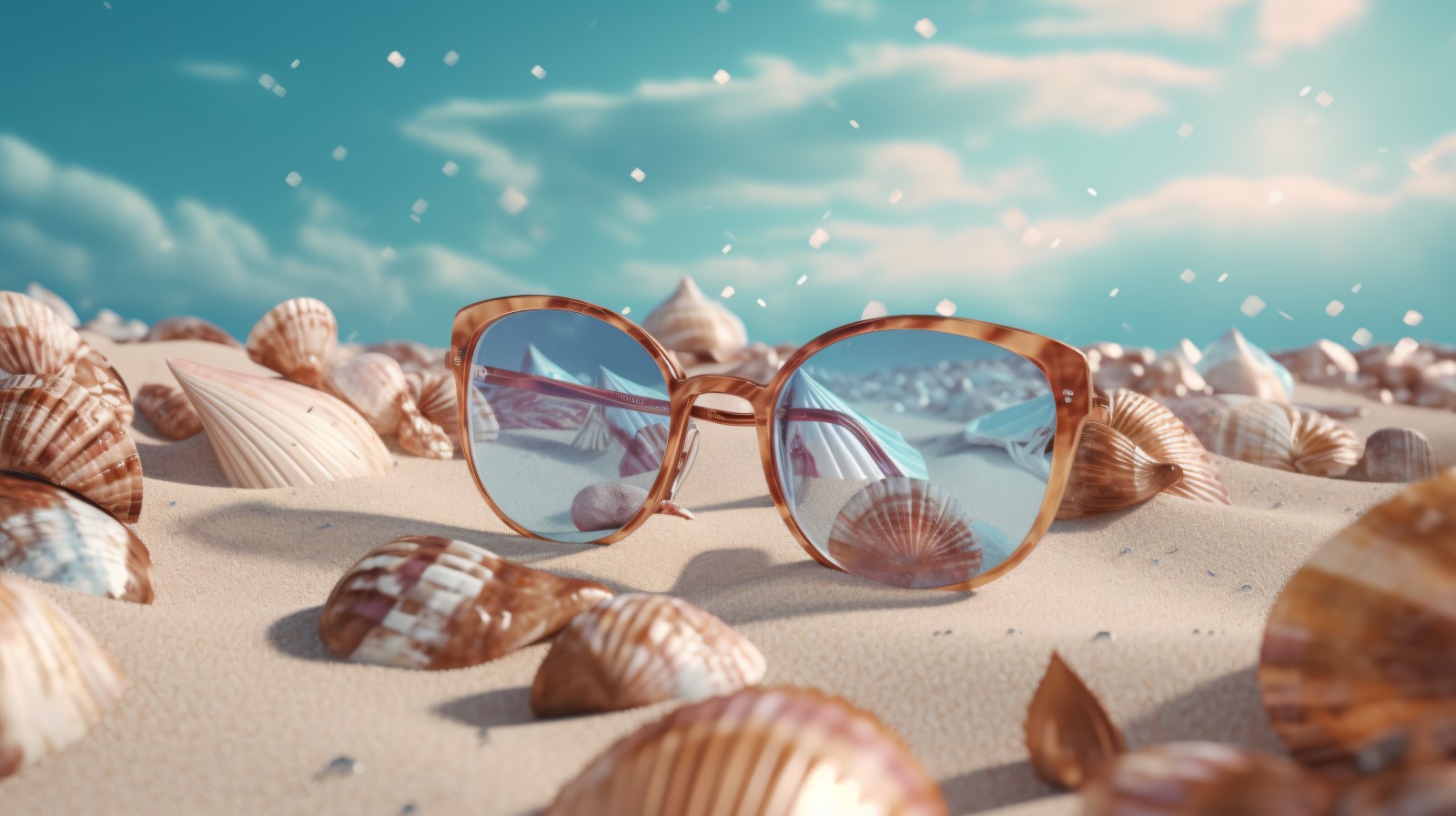 Embracing a minimalistic creative concept, transparent sunglasses and seashells accentuate the essence of summer, while halved pineapples and sunglasses casually placed on the sand exude tropical vibes. As the warmth of a sunny day transitions into a breathtaking sunset behind dry floral plants and mountains, the magic of summer continues to unfold.