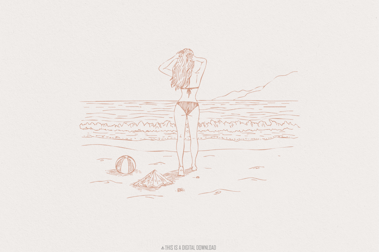 Beach Vibes PNG, Summer Line Art Design, Retro Beach Scene, Seaside Art Illustration, Beach Woman