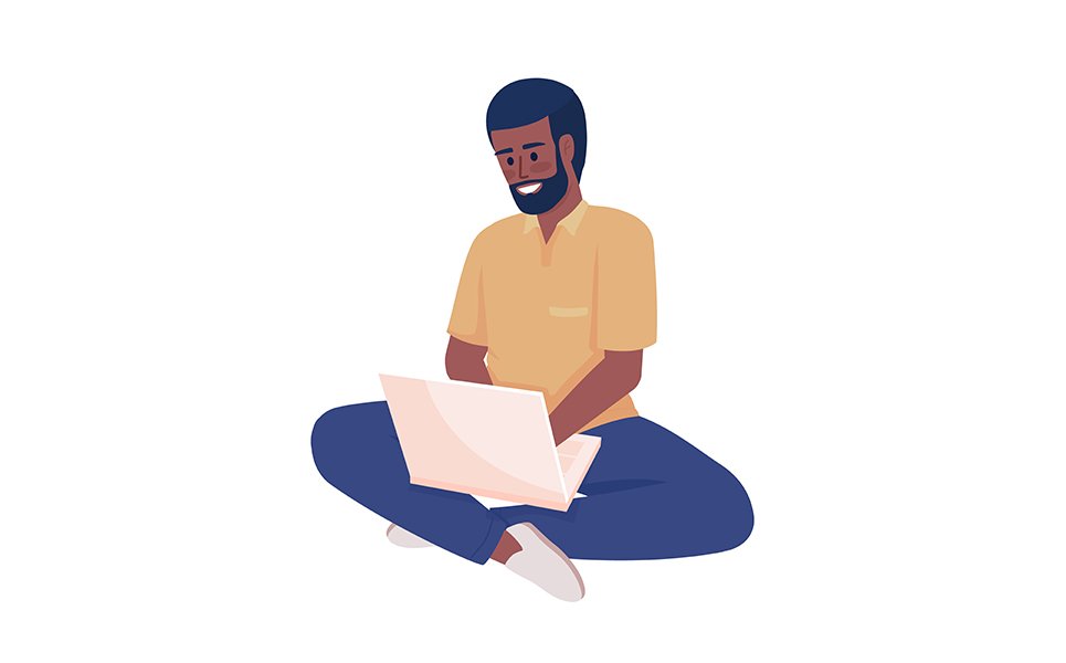 Bearded man with laptop semi flat color vector character. Editable figure. Full body person on white. Work and entertainment simple cartoon style illustration for web graphic design and animation .
