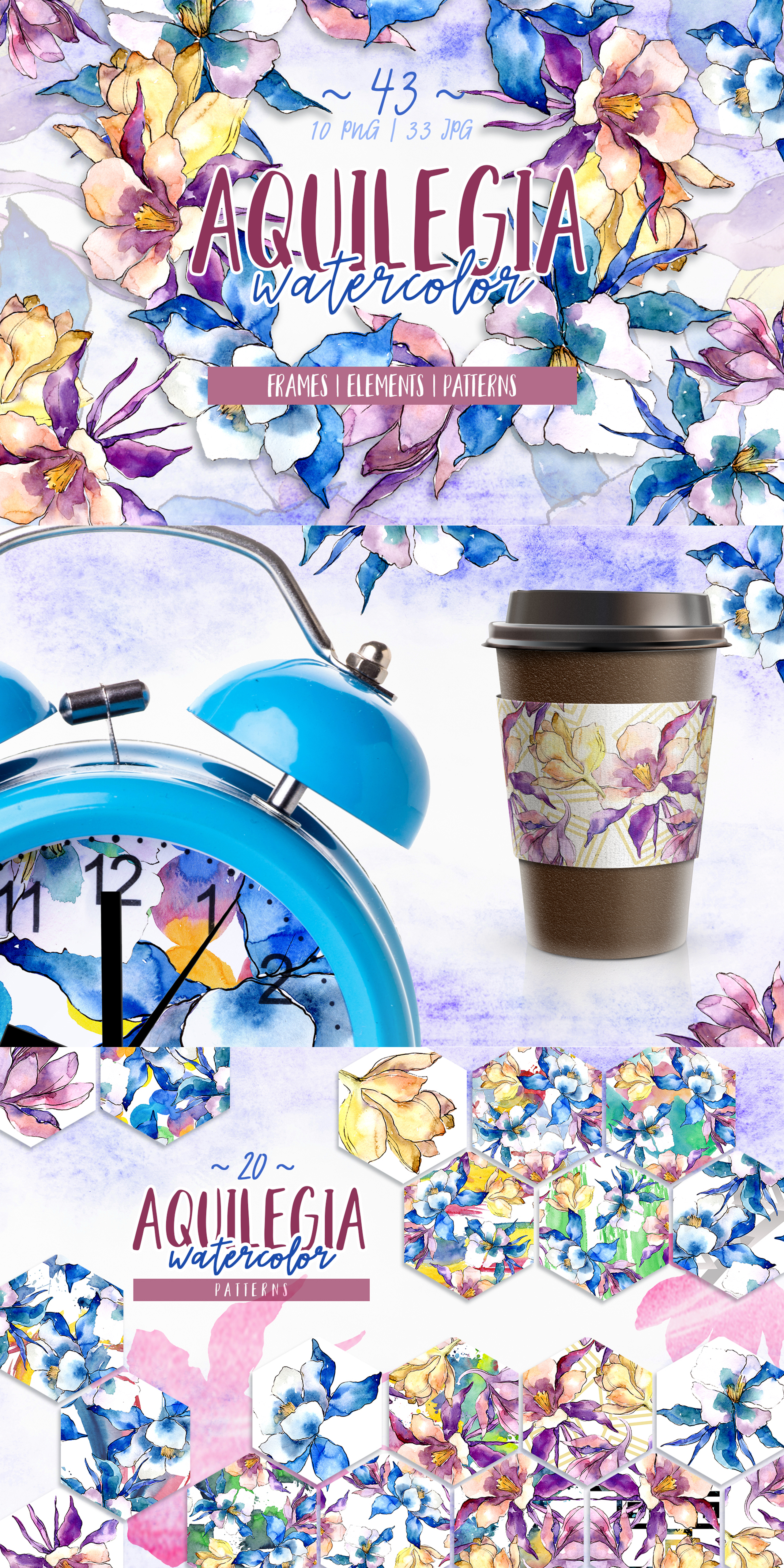 Wildflower colorful beautiful aquilegia flowers watercolor set of 43 files. Ideal material for DIY, wedding invitations, greeting cards, quotes, blogs, posters and more.