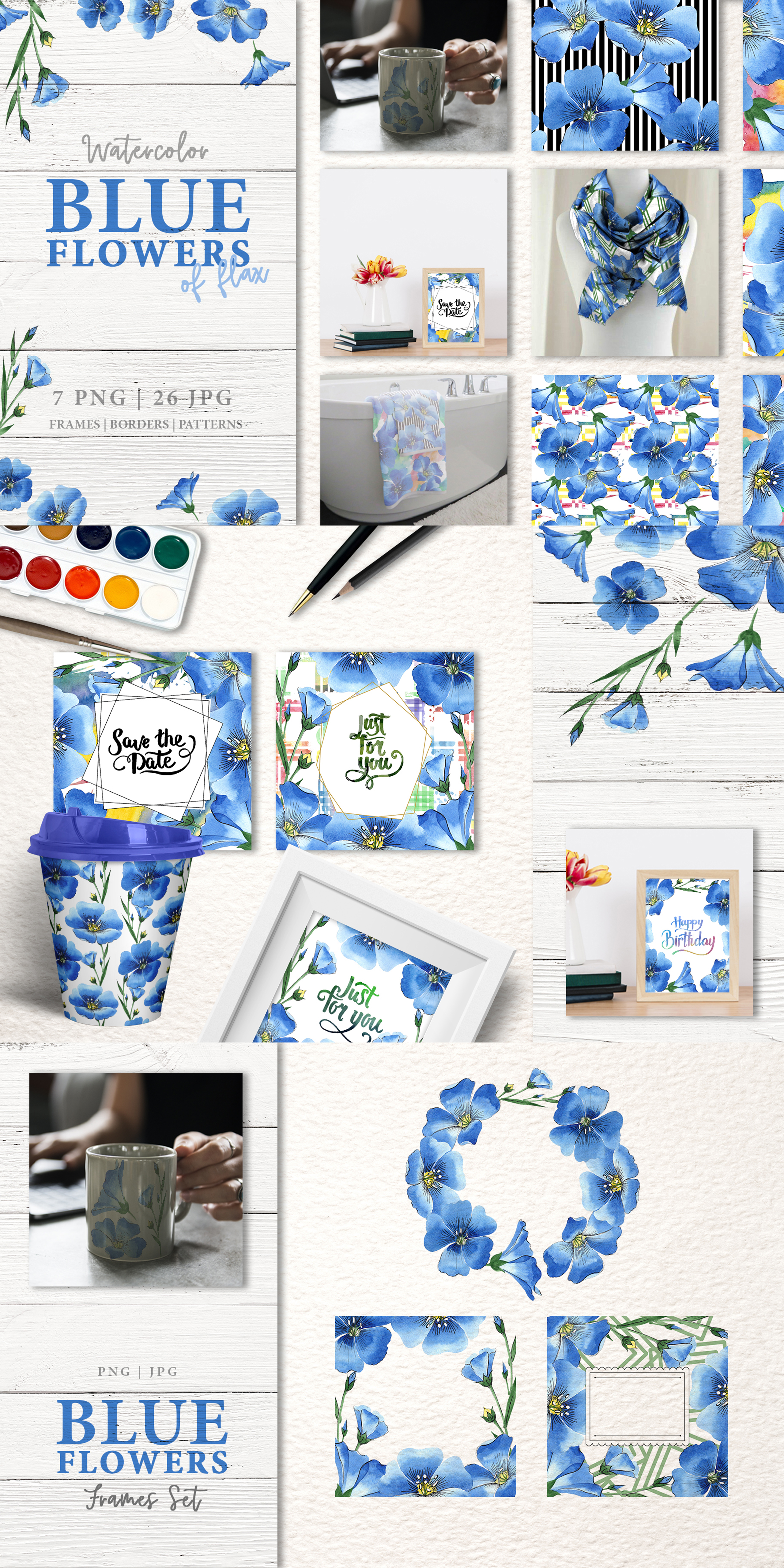 Blue flowers of flax Watercolor png clipart of 33 files. Ideal material for DIY, wedding invitations, greeting cards, quotes, blogs, posters and more.