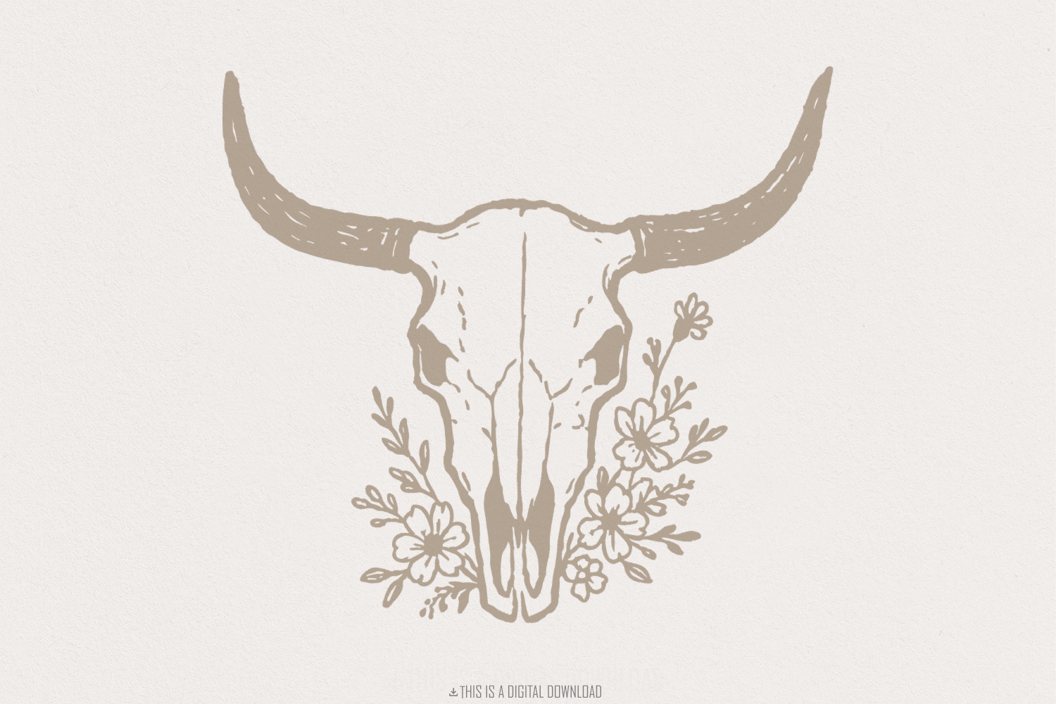 Boho Cow Skull PNG, Floral Skull Art, Steer Skull PNG, Rustic Western Horned Skull, Desert Motif Illustration