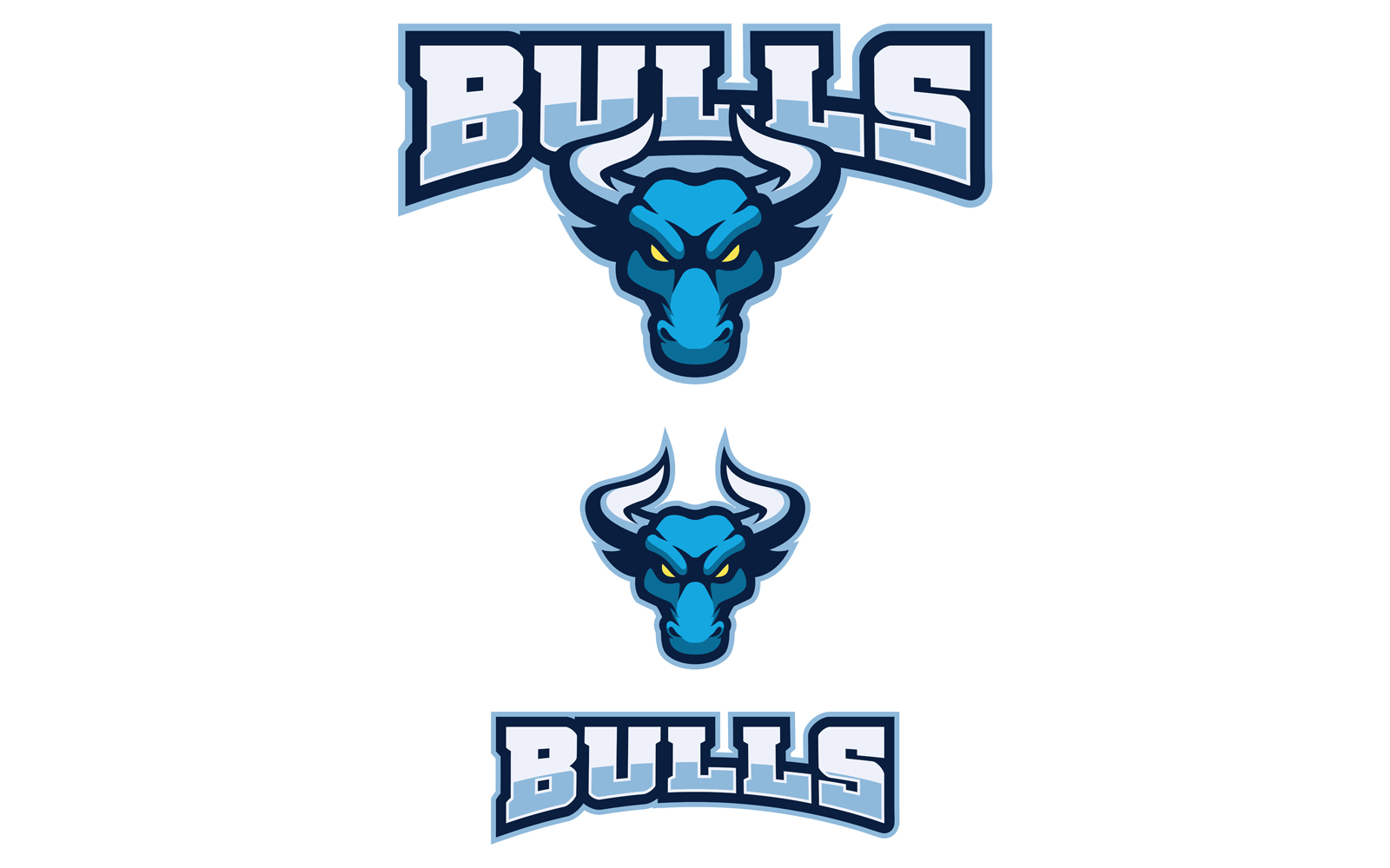 Cool mascot with blue bull isolated on white background and in 3 versions.
