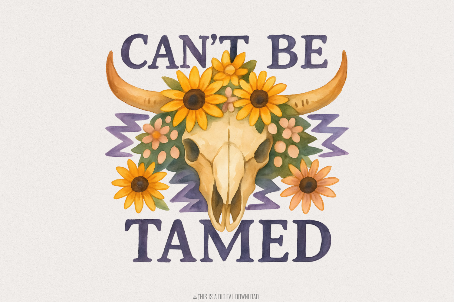 Can't Be Tamed Bull Skull Png, Western Cowgirl Png, Boho Floral Png, Cow Skull Art, Sublimation Illustration