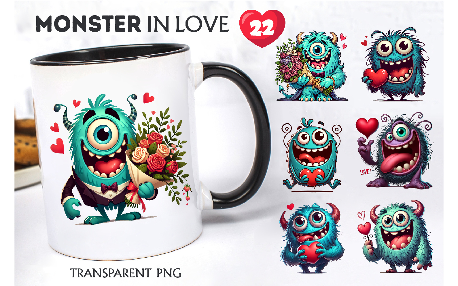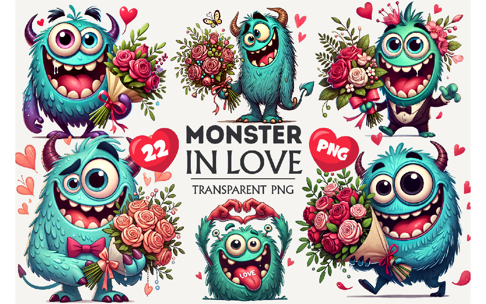 22 Funny Monsters in Love, with Heart and Flowers. Valentine's Day Clip Art is a great choice for creating cards, invitations, party supplies and decorations, logos, planners, wall decor, your blog design, literary illustrations or making stickers.