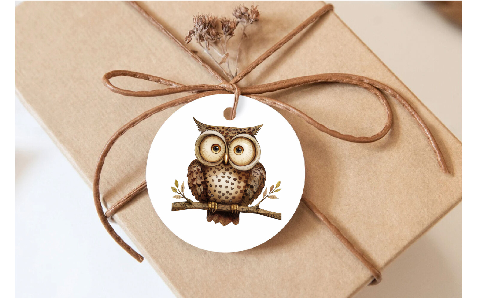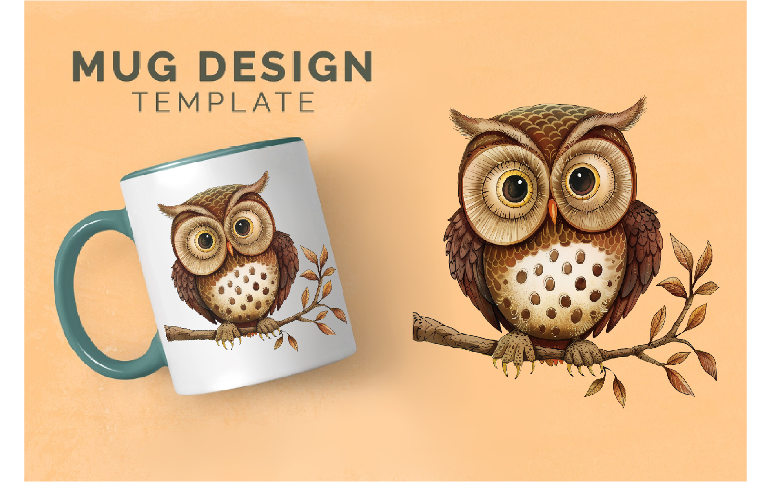 Brown cartoon horned owls with decorative spotted plumage on chest and wings sitting on a branch. Retro stylized forest owls.