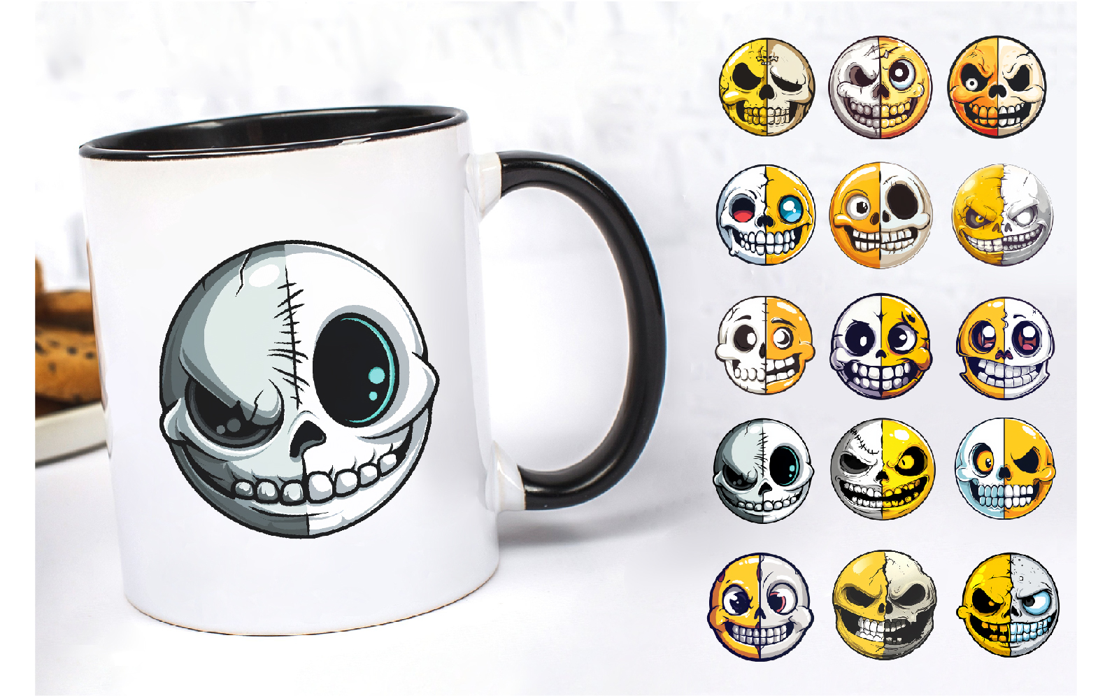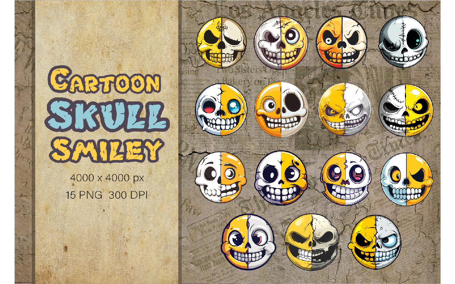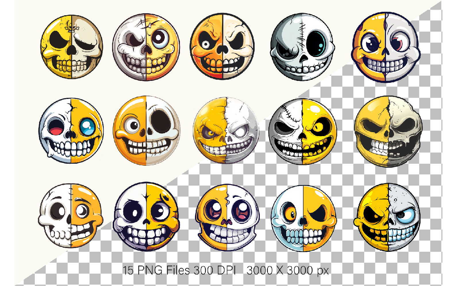 15 Cartoon Emojis With Double Skull Face, Creepy Evil Smile.