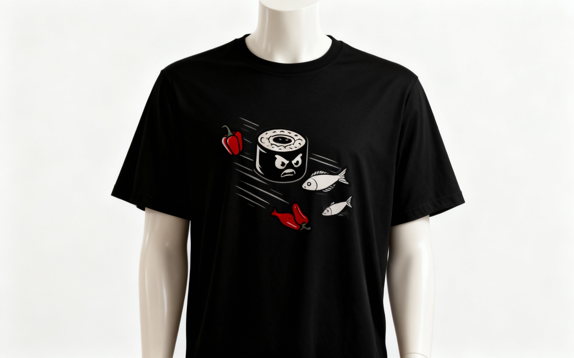 Angry Sushi Cartoon Mascot — a fun, bold, and creative illustration featuring a sushi roll character running with expressive chili peppers and a fish. Perfect for t-shirt prints, logo design, branding, sticker design, book covers, mugs, posters, packaging, and digital artwork.