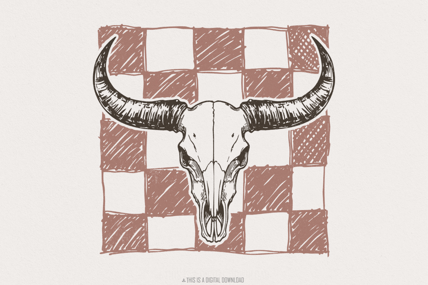 Checkered Longhorn Skull PNG, Western Bull Skull, Aztec Cow Skull, Digital Download, Country Illustration