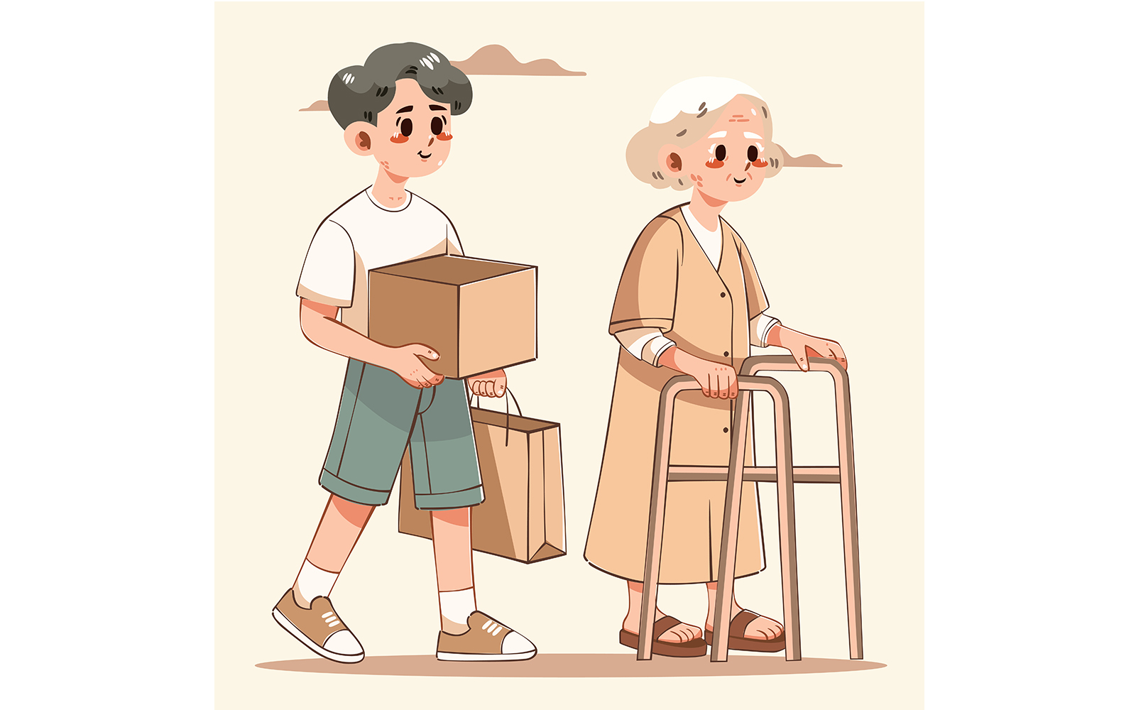 **An illustration of a young boy carrying gifts and an elderly woman using a walker, ideal for family-themed content**