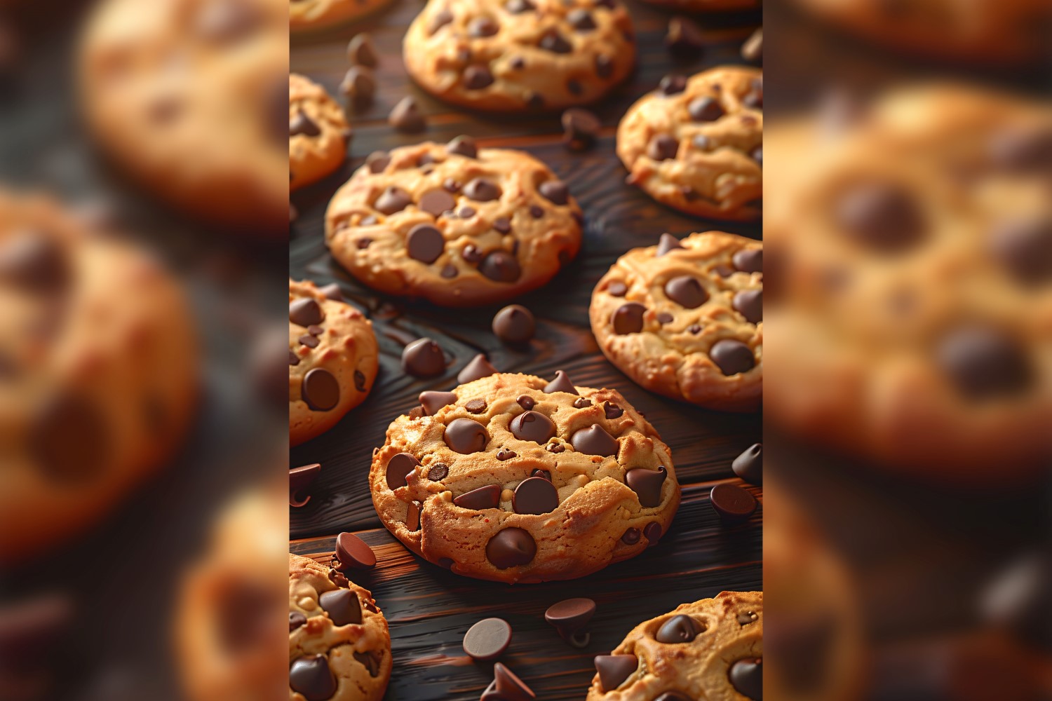 Experience the evolution of a classic treat as images depict various stages of enjoyment, from whole cookies to delectable crumbs. Marvel at the whimsical sight of flying chocolate chip cookies, their crispy edges and melty chocolate pieces inviting a heavenly taste sensation. These mouthwatering visuals, seamlessly generated by AI technology, celebrate the timeless appeal of chocolate chip cookies in stunning detail.