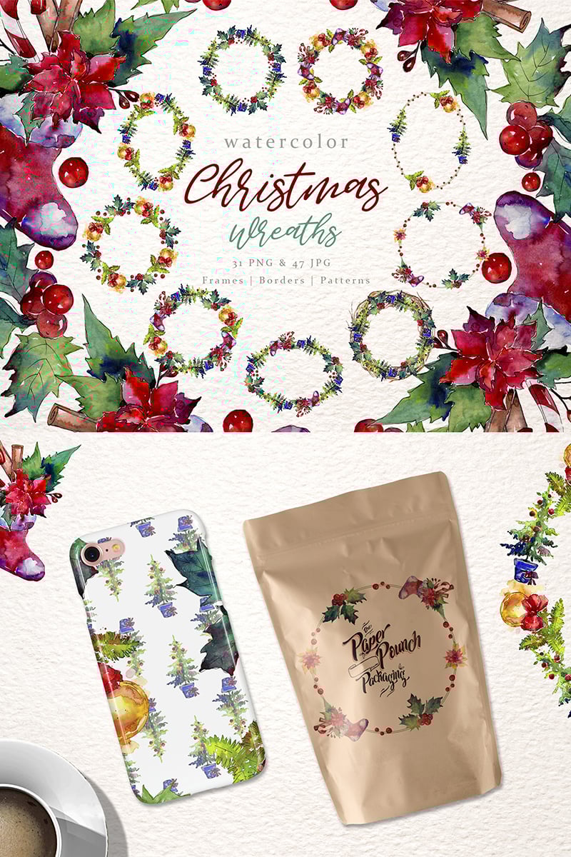 Christmas winter holiday collection pattern and wreath in a watercolor style of 78 files. Aquarelle christmas card for background, texture, wrapper pattern, frame or border. Ideal material for DIY, greeting cards, quotes, blogs, menu, posters and more.