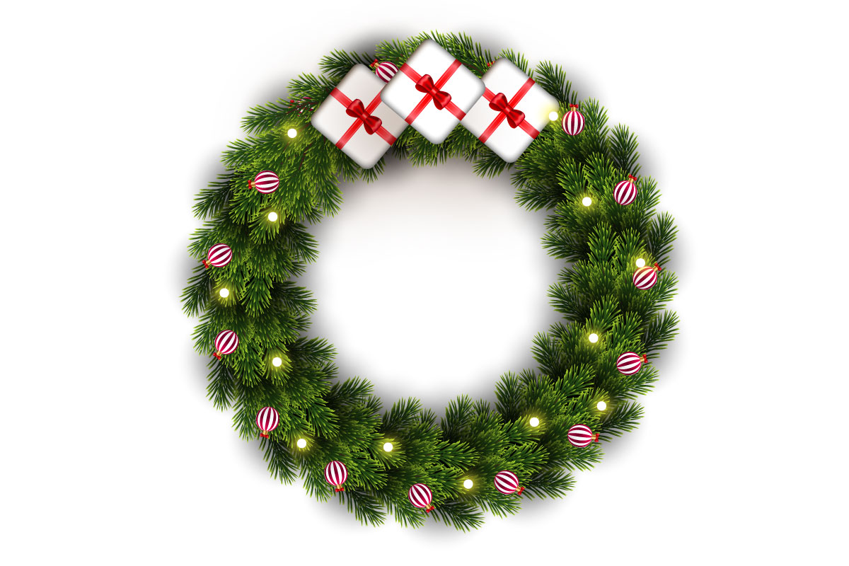 Christmas wreath decoration. wreath vector with pine leaves, Christmas balls, and a golden ribbon. christmas wreath on dark background. Ready to use for Multipurpose uses, All main elements are editable and customizable.