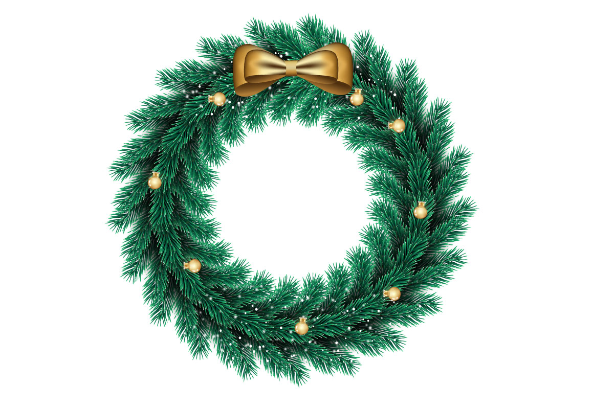 Christmas wreath decoration. wreath vector with pine leaves, Christmas balls, and a golden ribbon. christmas wreath on dark background. Ready to use for Multipurpose uses, All main elements are editable and customizable.