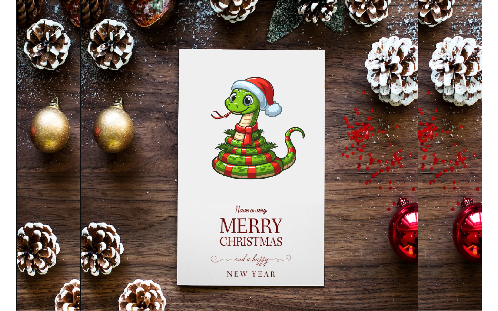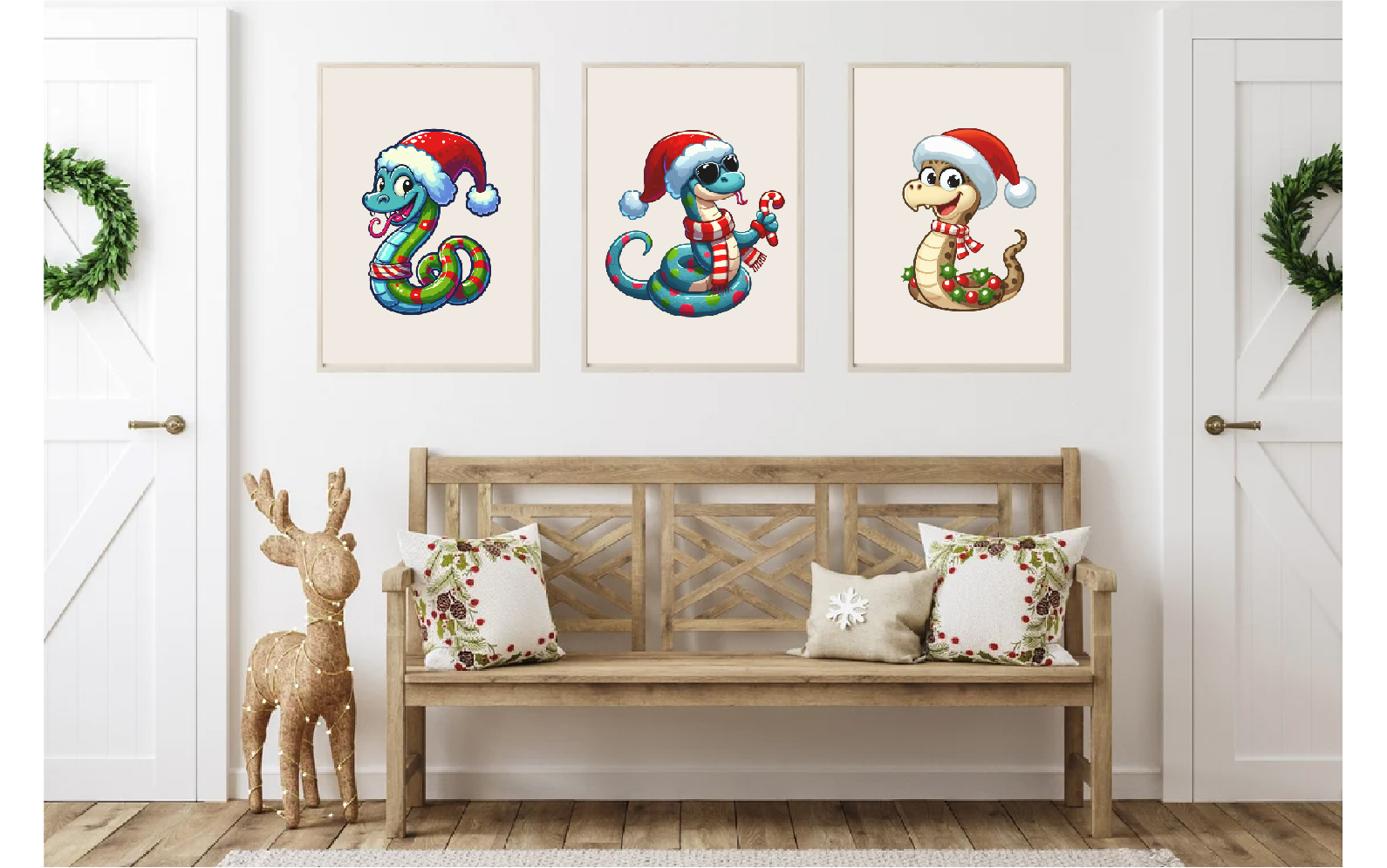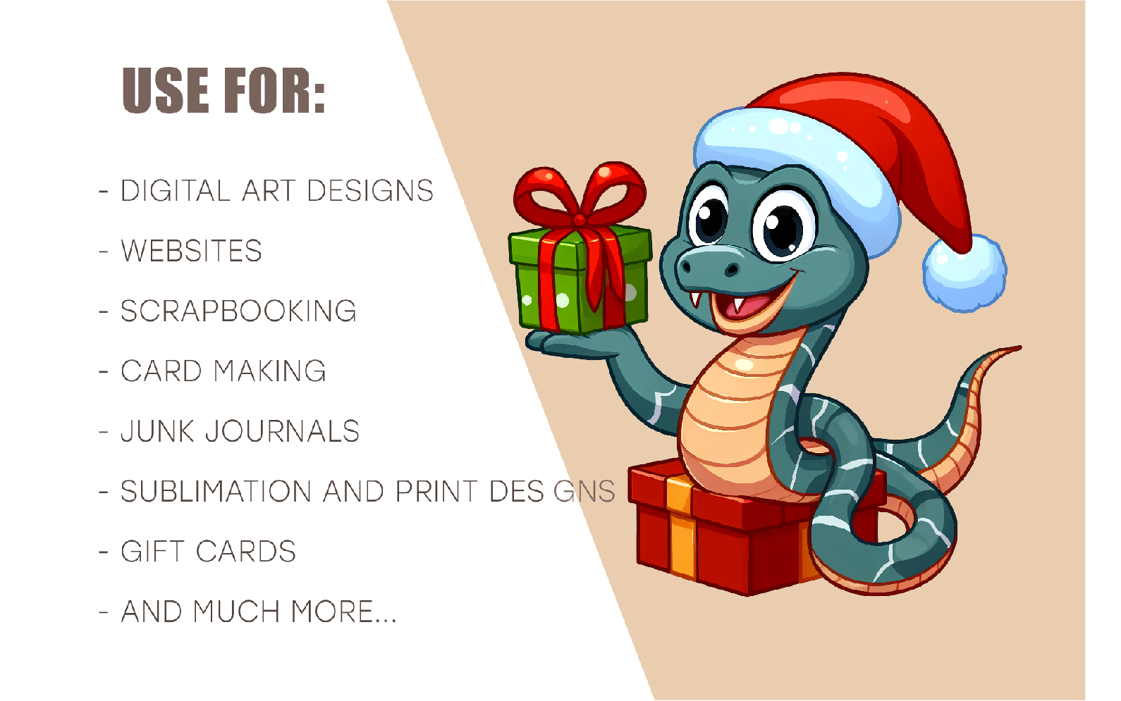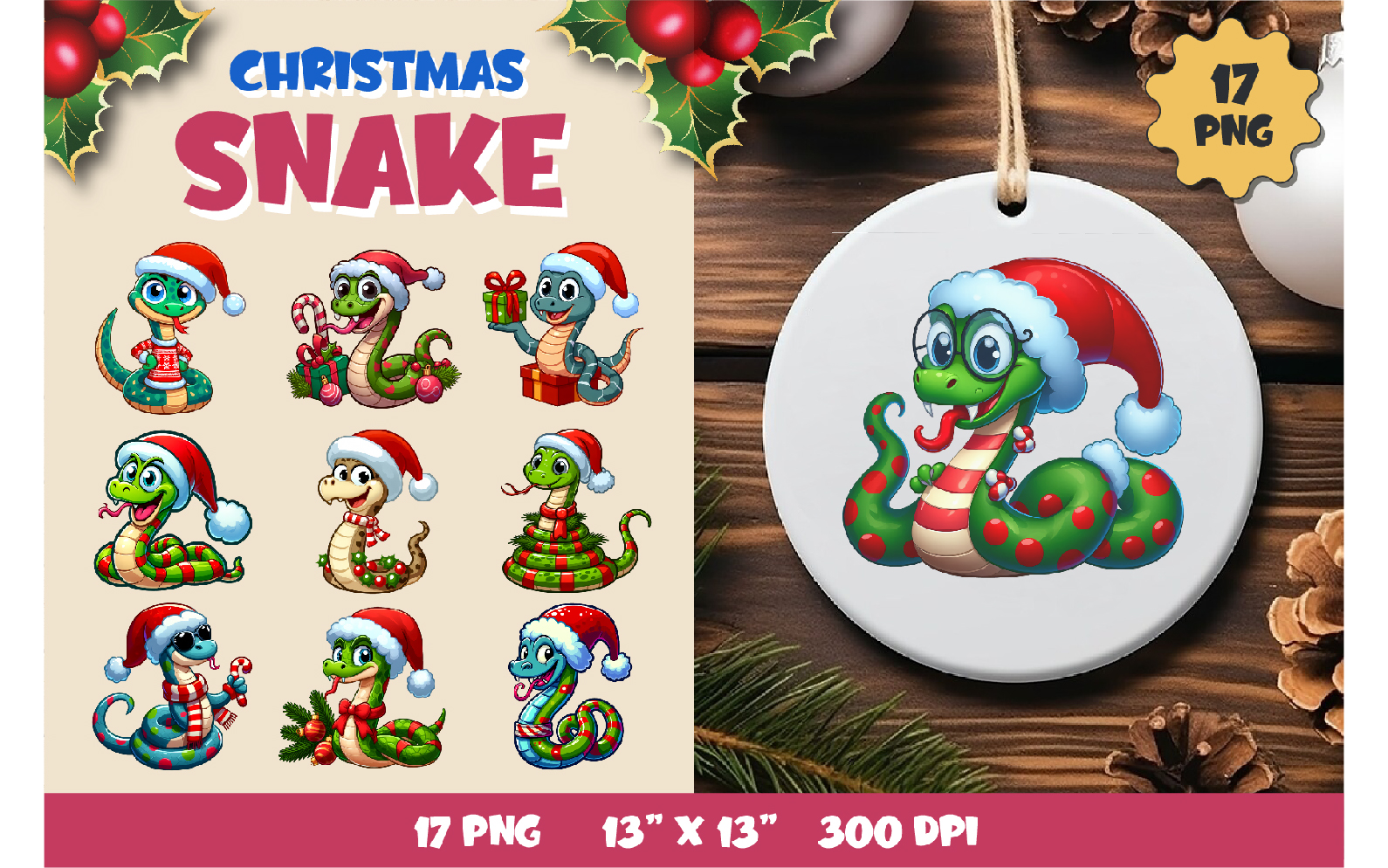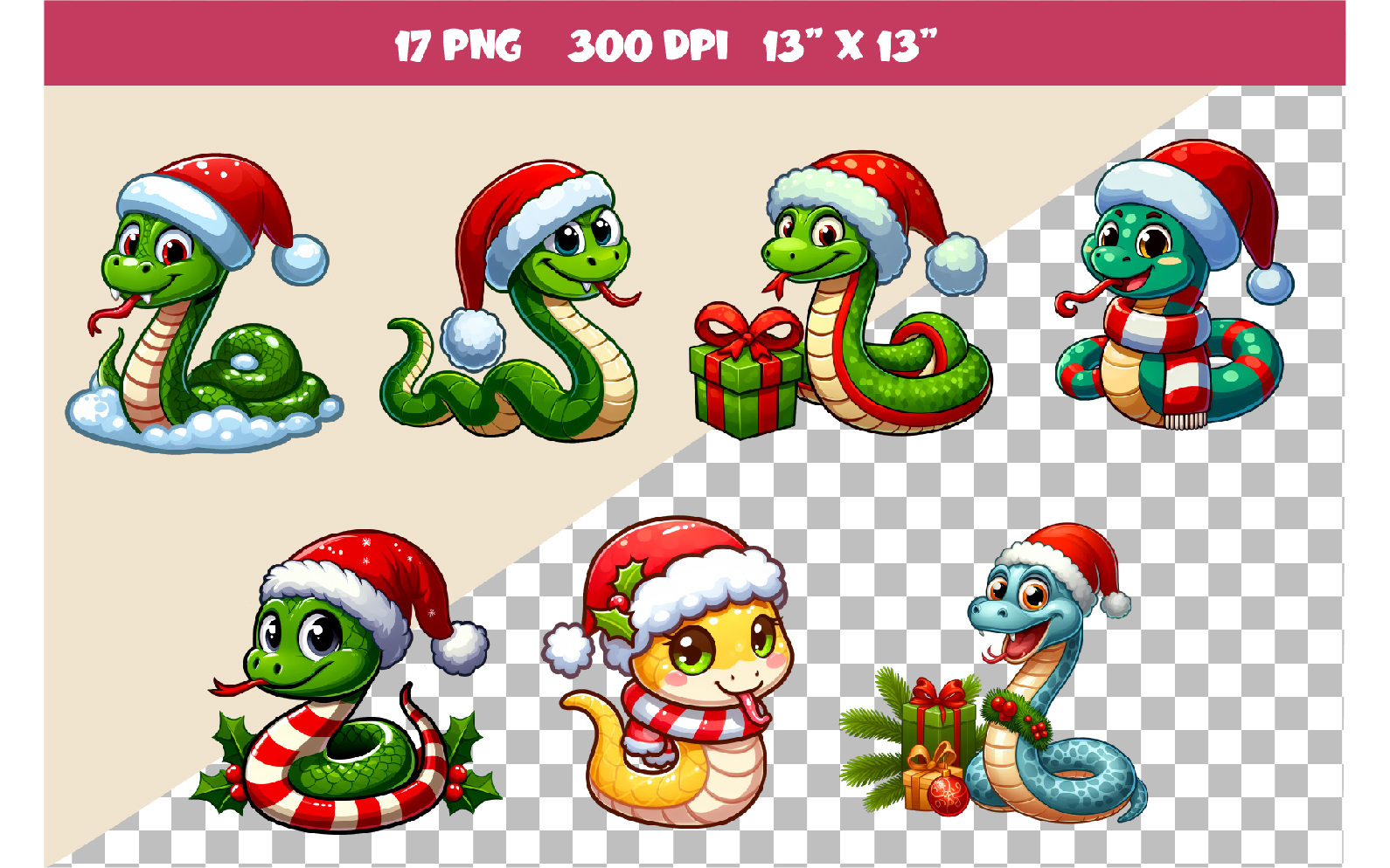 Set of 17 Christmas cartoon stickers PNG files with snake on transparent background. Can be used as stickers, magnets, cut out and turned into decorations, used as a shaped card or decorative element.