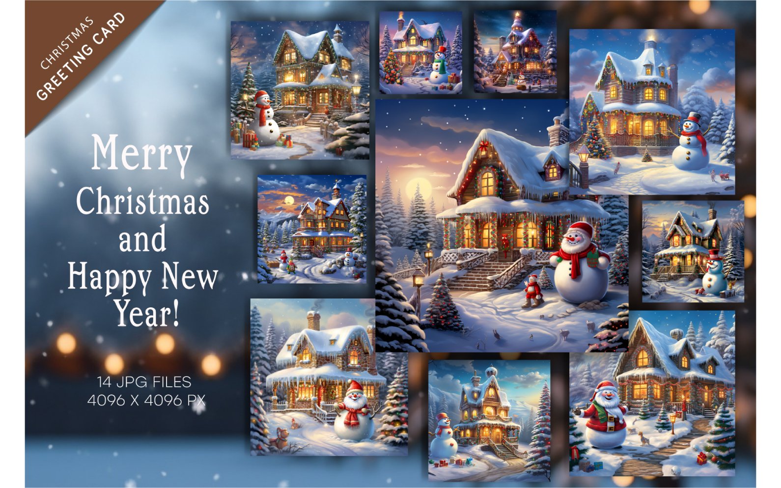 Christmas snowy house outside interior with winter landscape, snowman and fir trees. Christmas decorations.