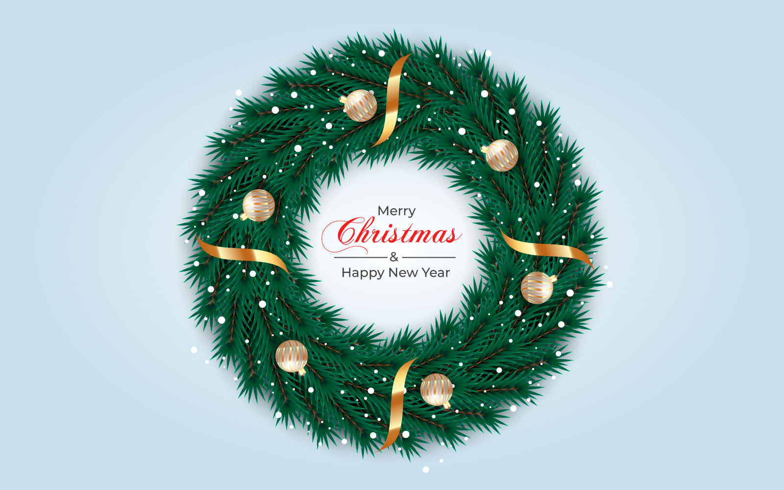 Christmas greeting card and background. Christmas wreath with bulbs and red, orange balls.