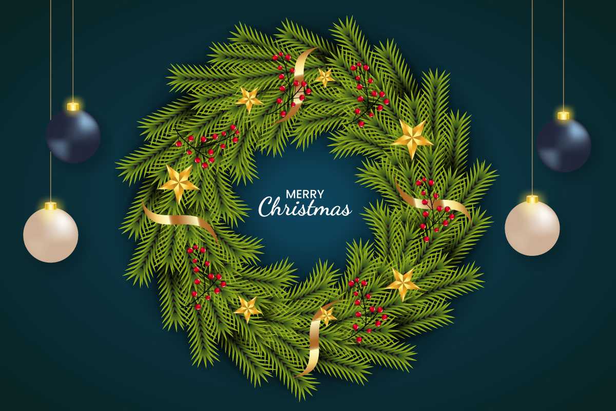 Christmas wreath decoration. wreath vector with pine leaves, Christmas balls, and a golden ribbon. christmas wreath on dark background. Ready to use for Multipurpose uses, All main elements are editable and customizable.