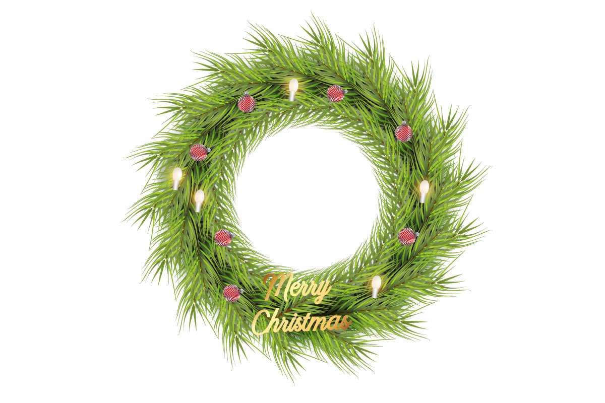 Christmas wreath decoration. wreath vector with pine leaves, Christmas balls, and a golden ribbon. christmas wreath on dark background. Ready to use for Multipurpose uses, All main elements are editable and customizable.