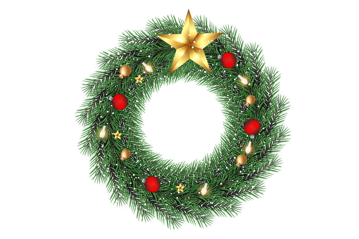 Christmas wreath decoration. wreath vector with pine leaves, Christmas balls, and a golden ribbon. christmas wreath on dark background. Ready to use for Multipurpose uses, All main elements are editable and customizable.