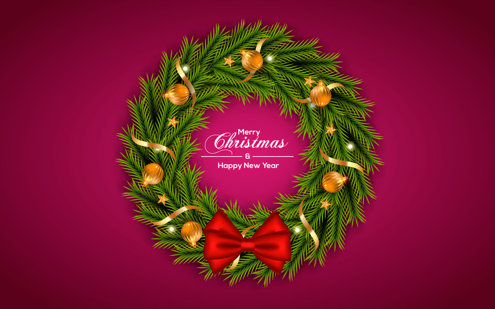 Christmas greeting card and background. Christmas wreath with bulbs and red, orange balls.