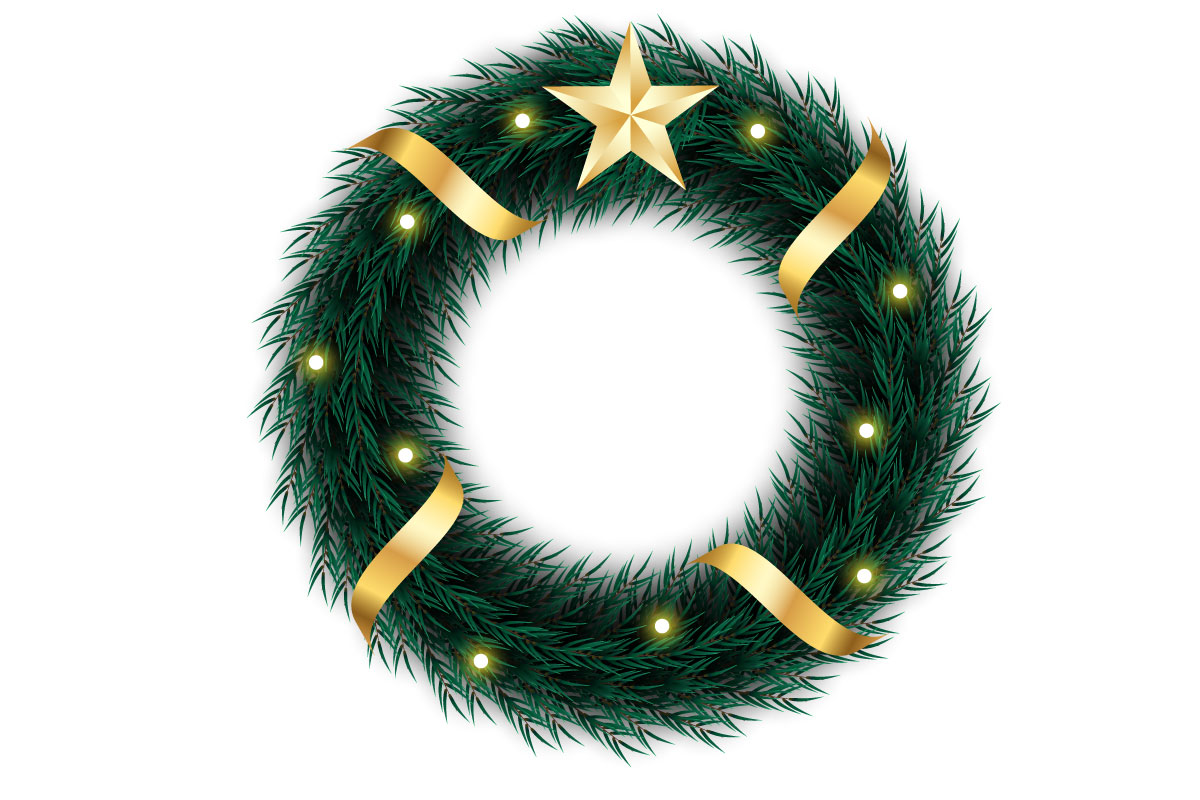 Christmas wreath decoration. wreath vector with pine leaves, Christmas balls, and a golden ribbon. christmas wreath on dark background. Ready to use for Multipurpose uses, All main elements are editable and customizable.