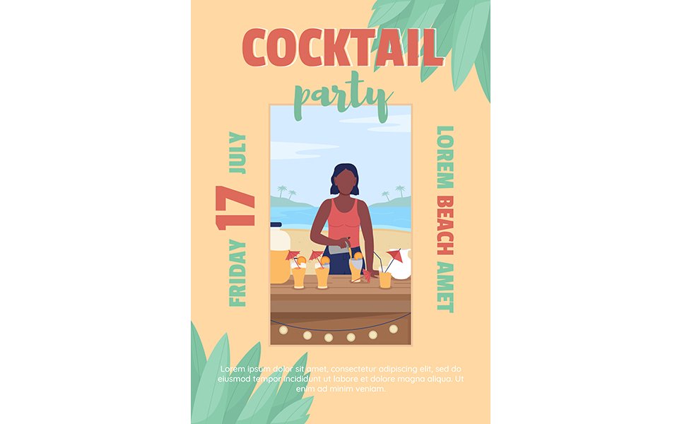 Cocktail party on beach flat vector banner template. Summer fest poster, leaflet printable color designs. Editable flyer page with text space. Passion One, Brusher, Quicksand fonts used