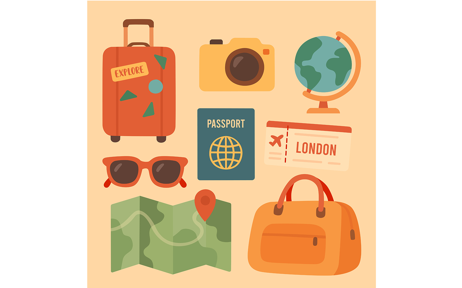 **The illustration features a collection of travel-related objects set, includes accessories such as handbags and luggage, associated with traveling and holidays**