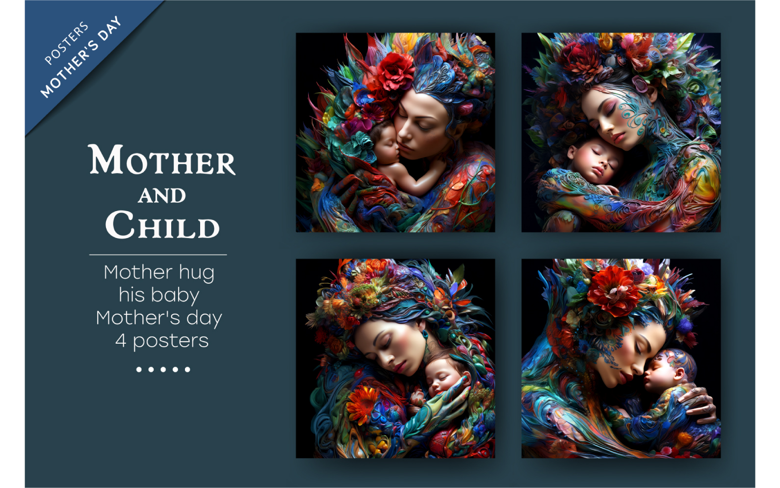 Mother hug his baby Mother's day posters design. Set of 4 Colorful posters. Ideal for many projects: covers, cards, posters, invitations, product designs.