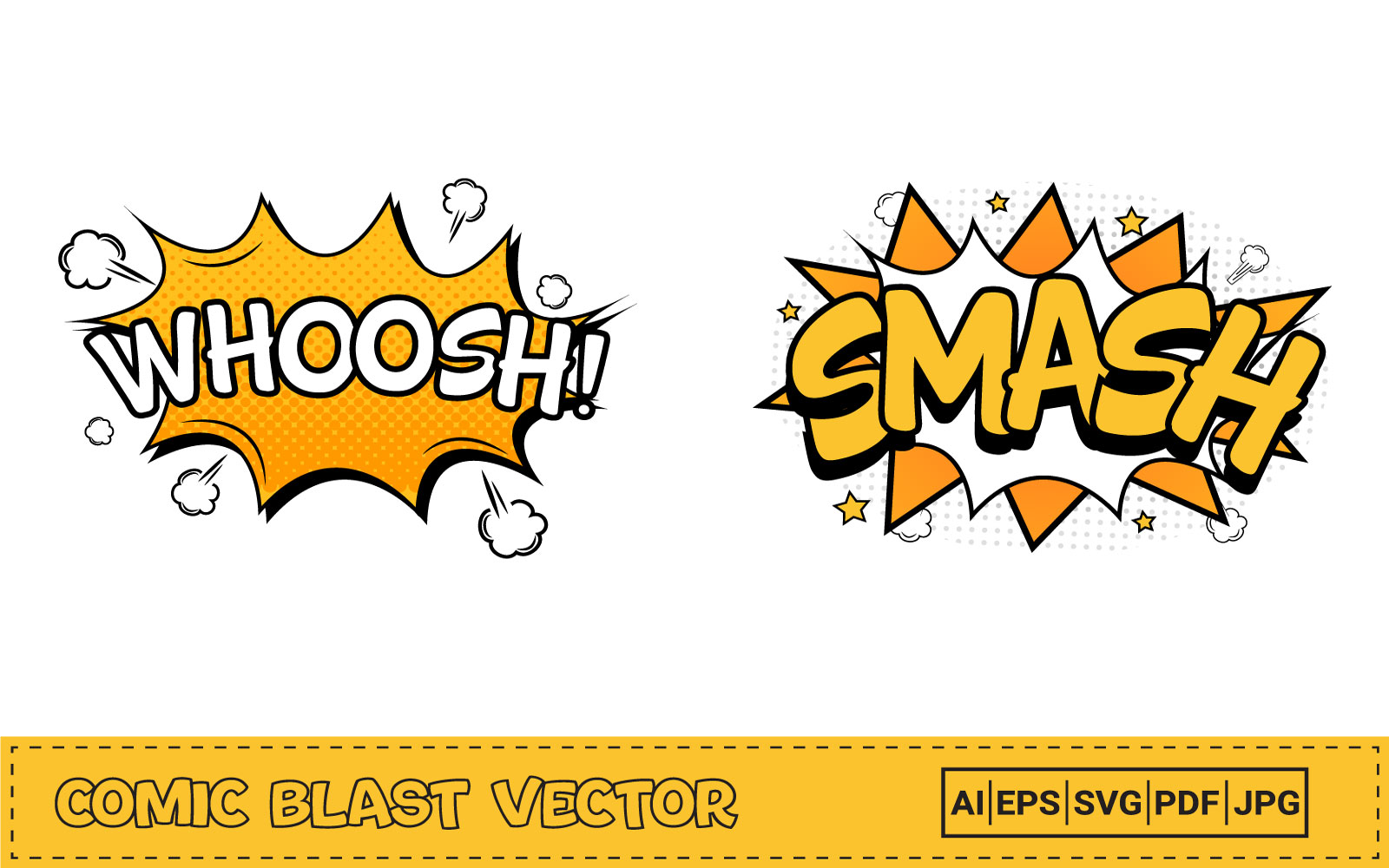 Comic explosion set with cloud bubbles. Whoosh comic burst with white, orange, and yellow colors. Smash comic explosion with white and yellow color. Comic burst explosion. Whoosh burst with bubble for cartoon speeches. Comic blast vector.