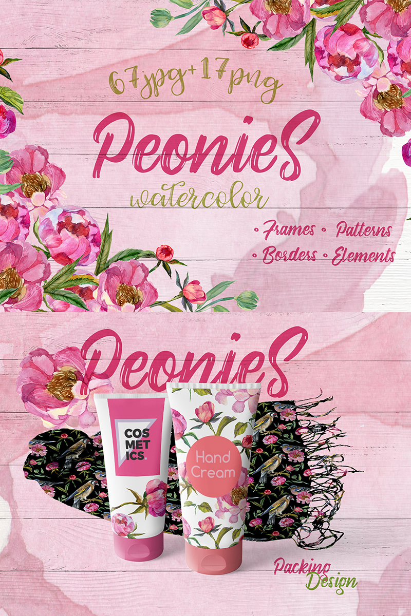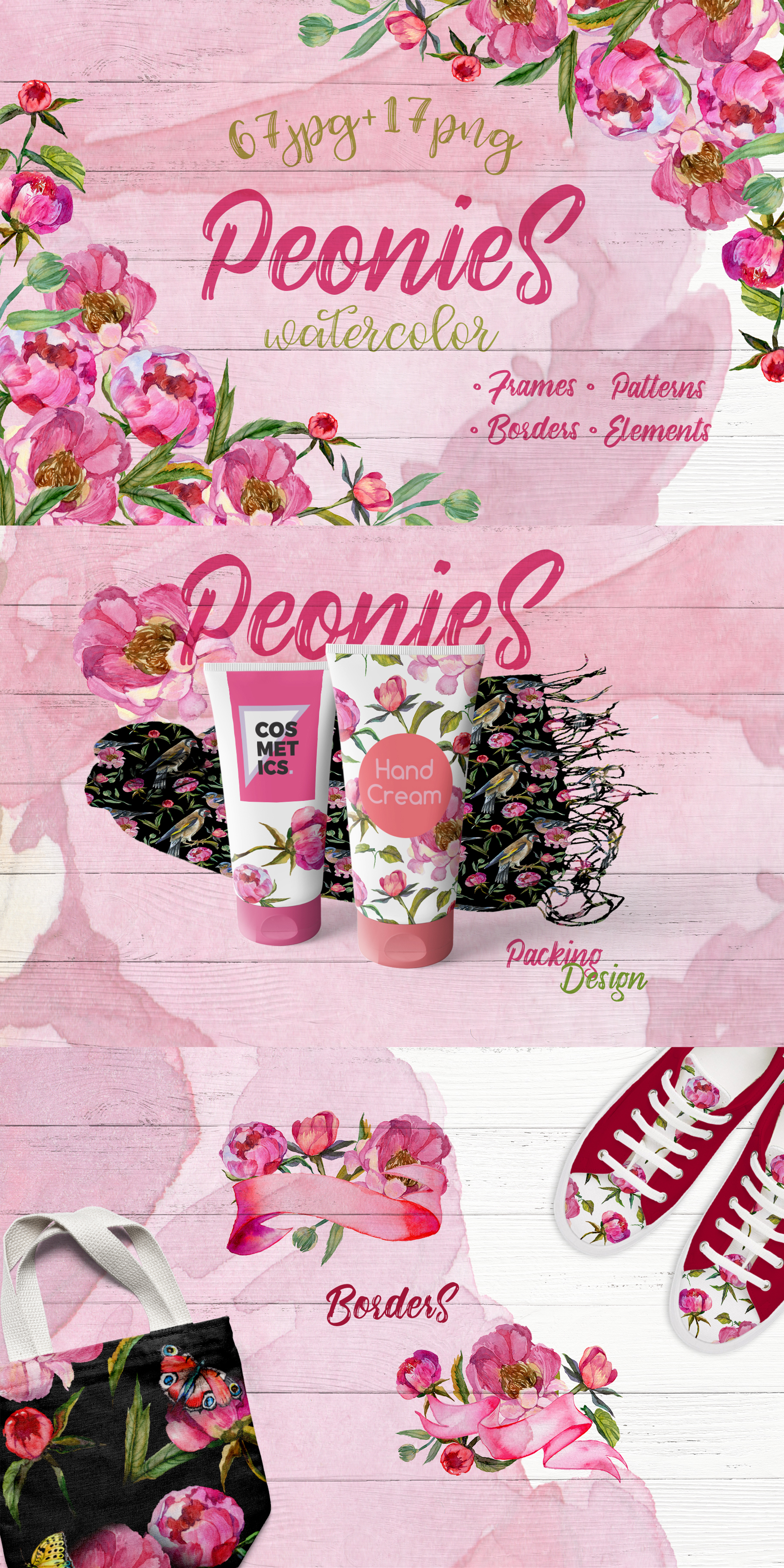 Wildflower cool peonies pink color watercolor set of 84 files. Ideal material for DIY, wedding invitations, greeting cards, quotes, blogs, posters and more.
