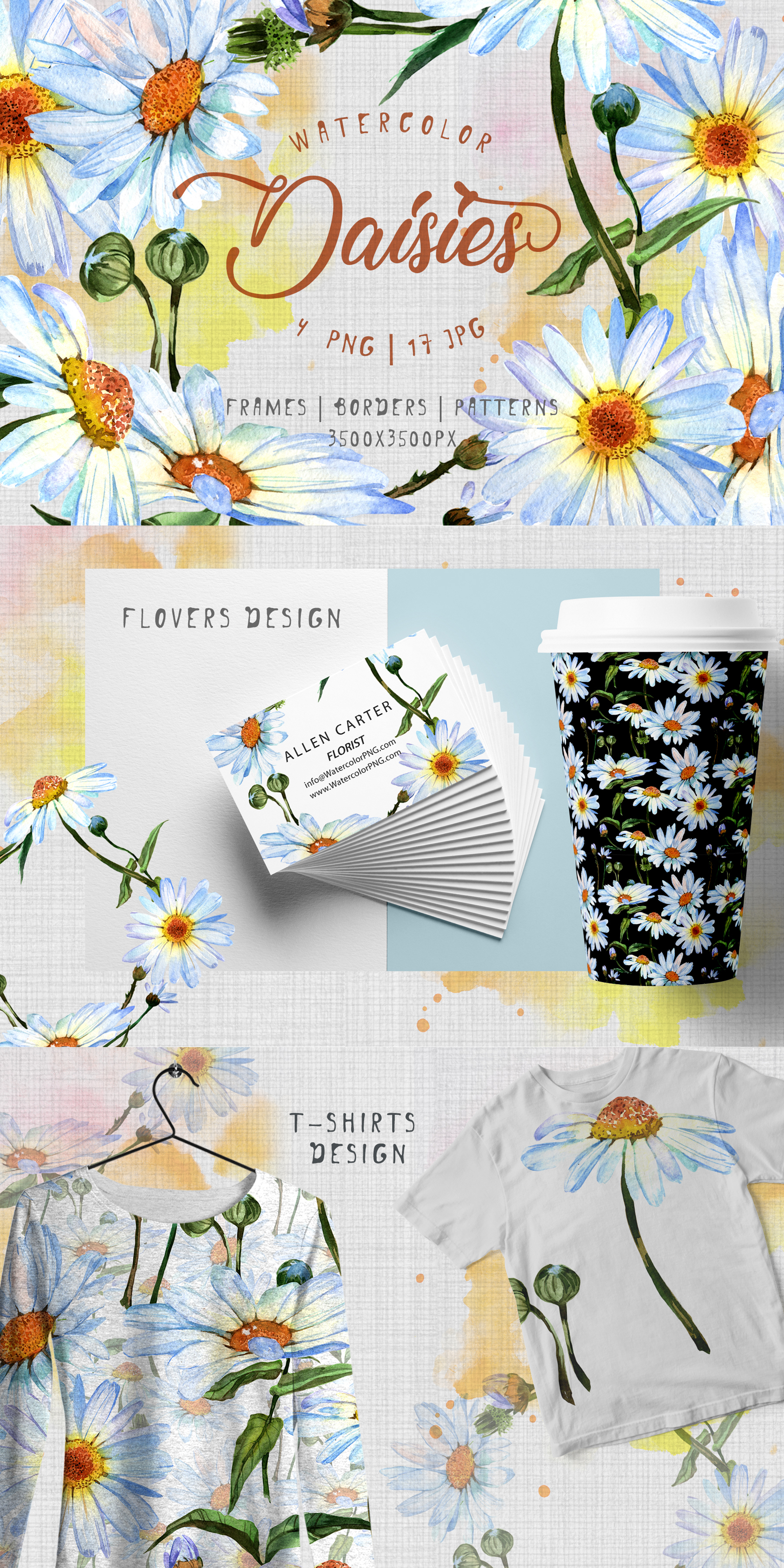 Wildflower white daisies flowers watercolor set of 21 files. Ideal material for DIY, wedding invitations, greeting cards, quotes, blogs, posters and more.