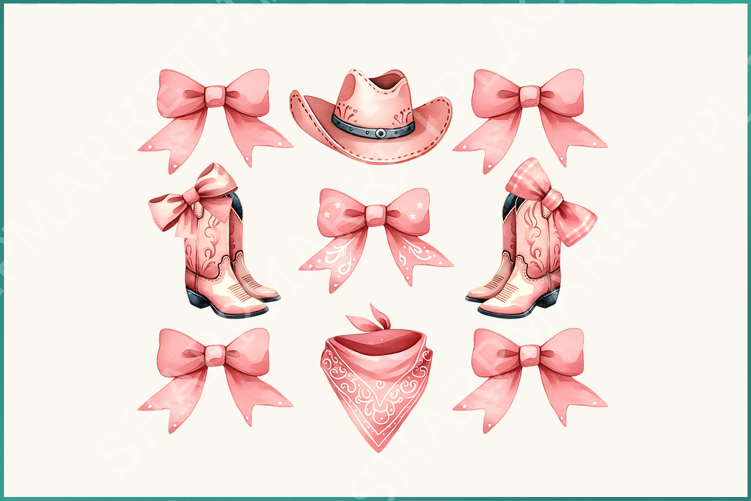 Dive into the whimsical world of Western fashion with our Coquette Cowgirl PNG ! This set features a beautifully crafted design that captures the essence of a modern cowgirl with a coquette twist. Each element, from the pink ribbon tees to the stylish cowgirl boots, is rendered in vibrant watercolor to give your projects a touch of aesthetic charm.