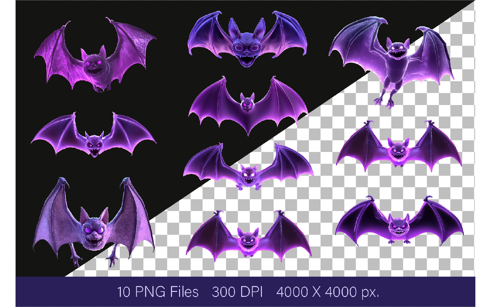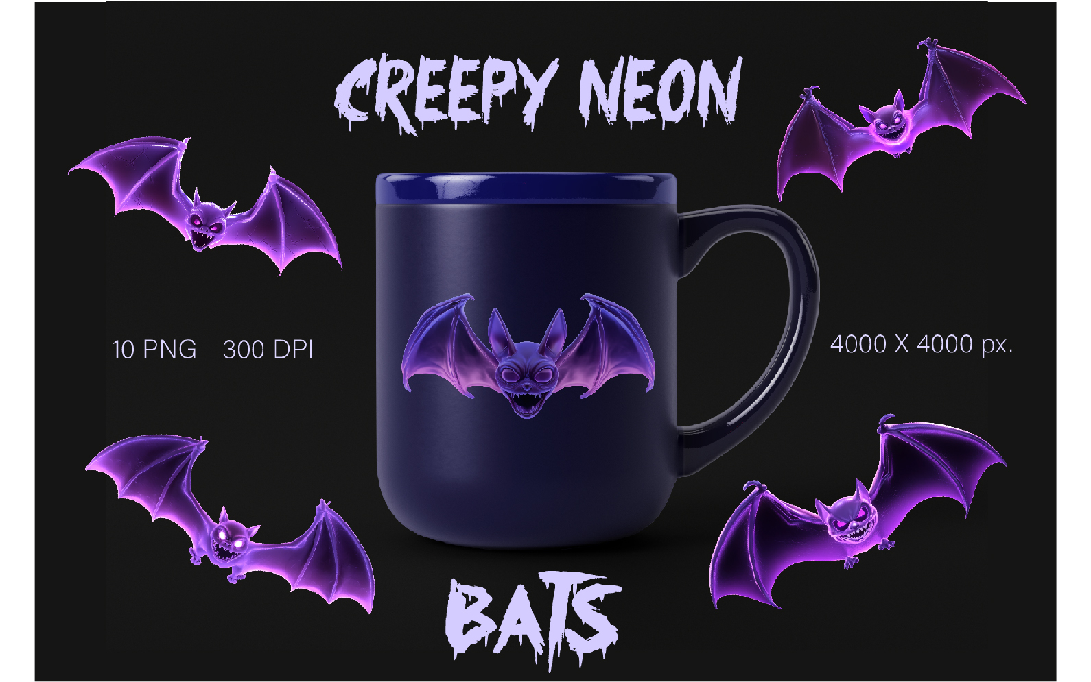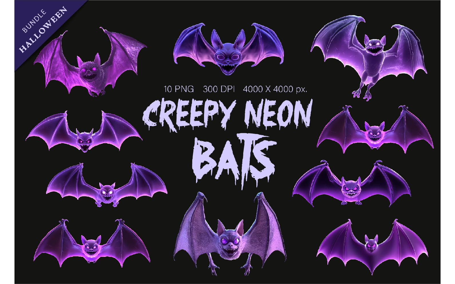 Bundle of Creepy Neon Bats, PNG format for sublimation on dark backgrounds.