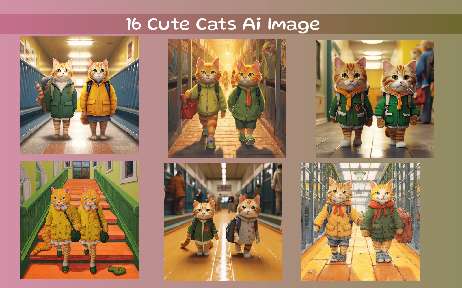 Cute cats at school (Ai Image). This product are suitable to any design products, especially in animal category.There are 16 jpg files in the picture package prepared with artificial intelligence. Endless cute cat cartoon design for book covers, wallpapers, and wrapping papers, collage, scrapbook elements, christmas and winter scenes, gift wrap, social media posts, poster, banner, web, stationery, and as teaching resources