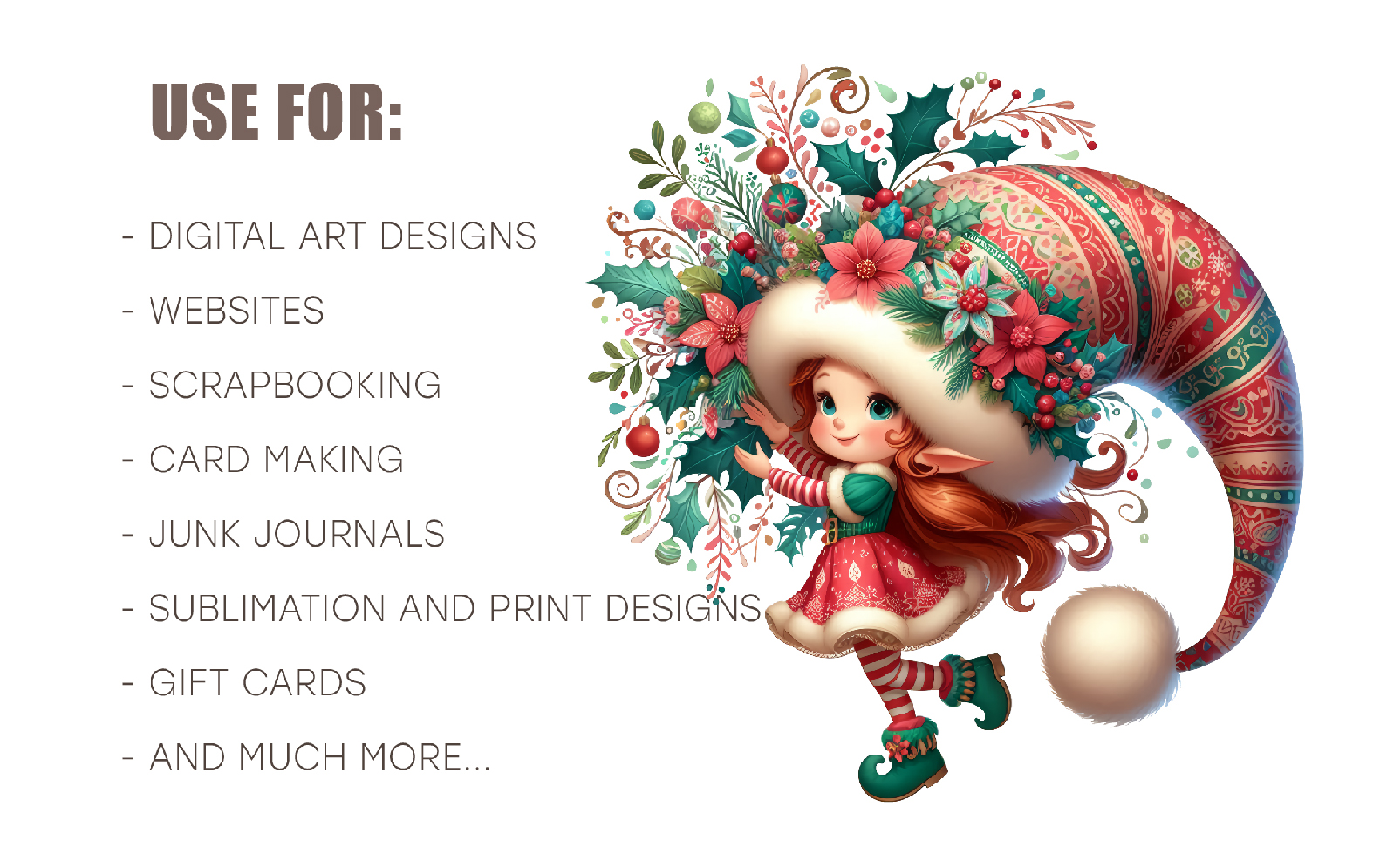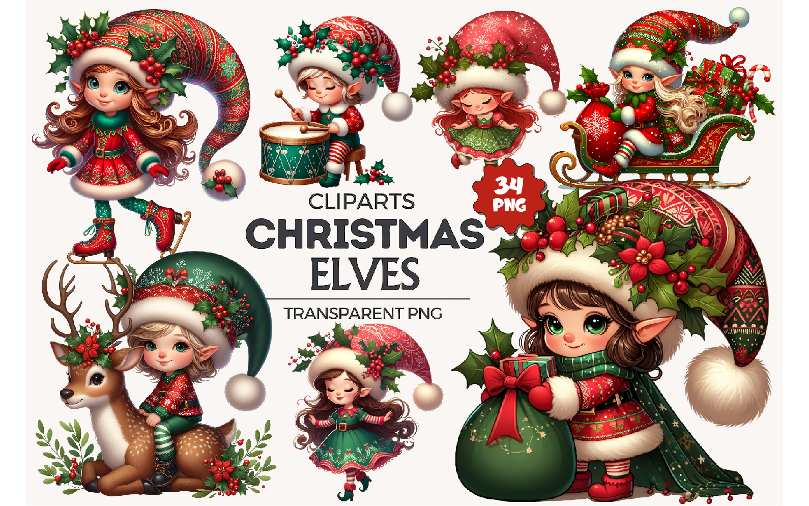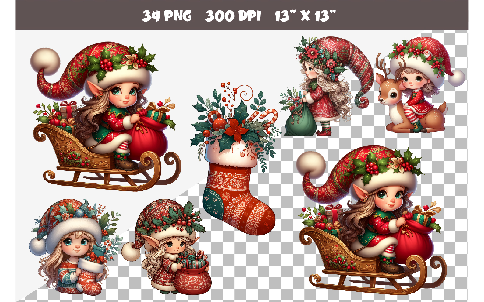 An adorable collection of Christmas elves clipart PNG images with transparent backgrounds featuring 34 festive designs of cute elves. Perfect for holiday projects, digital art, and sublimation designs. High resolution and printable for all your creative needs. Add a little holiday magic with these adorable and whimsical elf clipart images. Bonus "Christmas stocking".