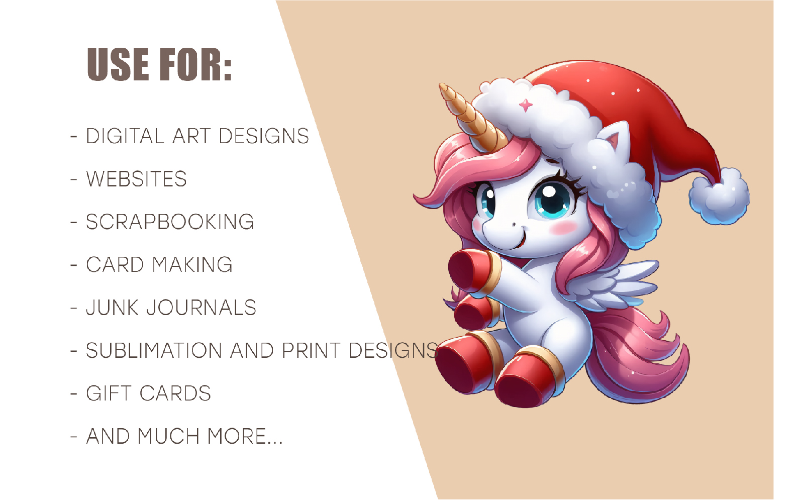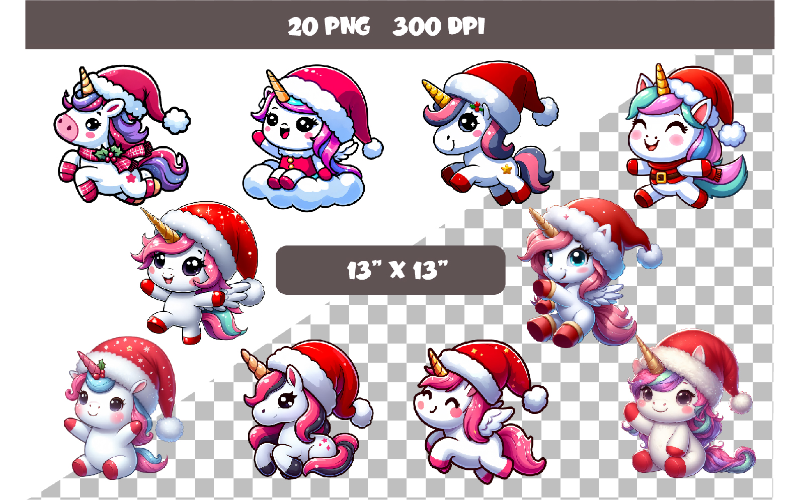 Set of 20 Christmas stickers PNG with colorful unicorn on transparent background. Can be used as stickers, magnets, cut out and turned into decorations, used as a shaped card or decorative element.